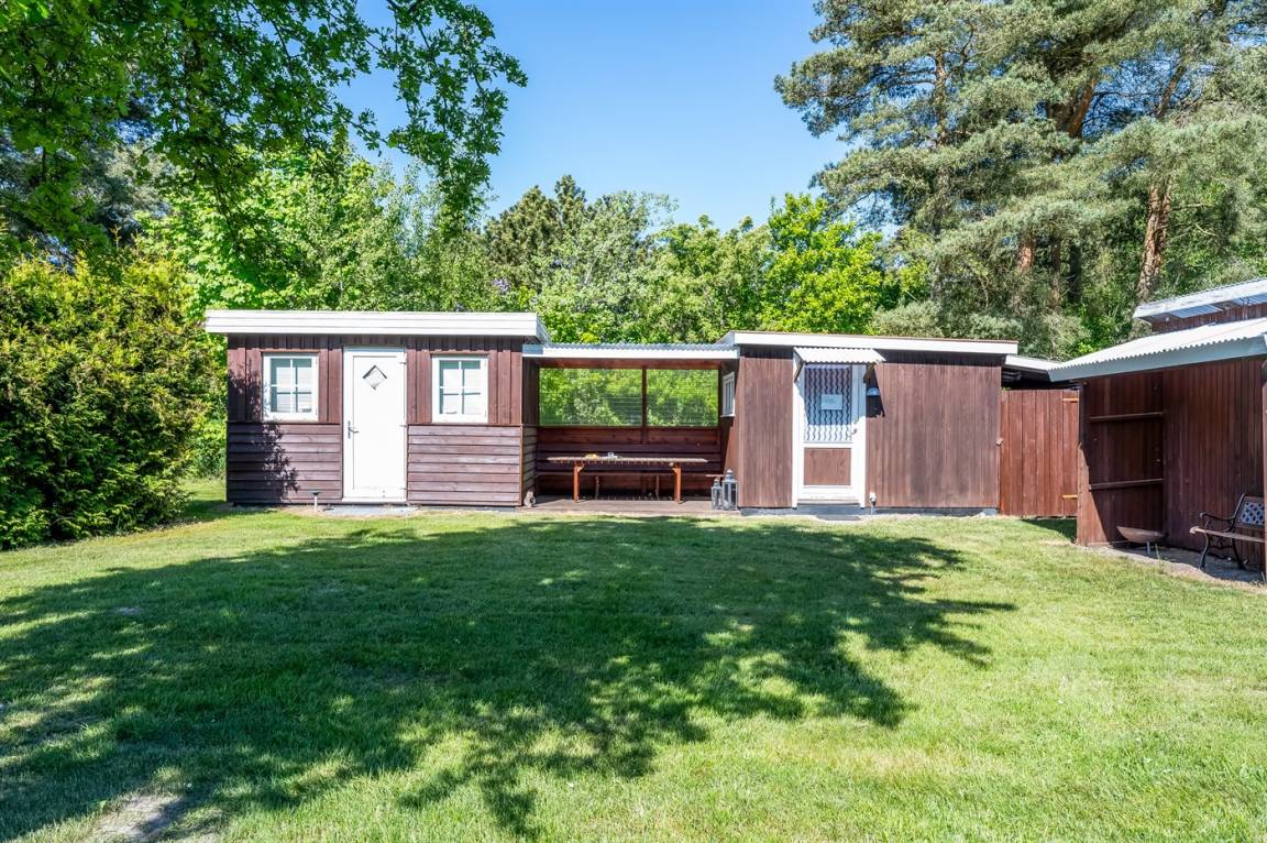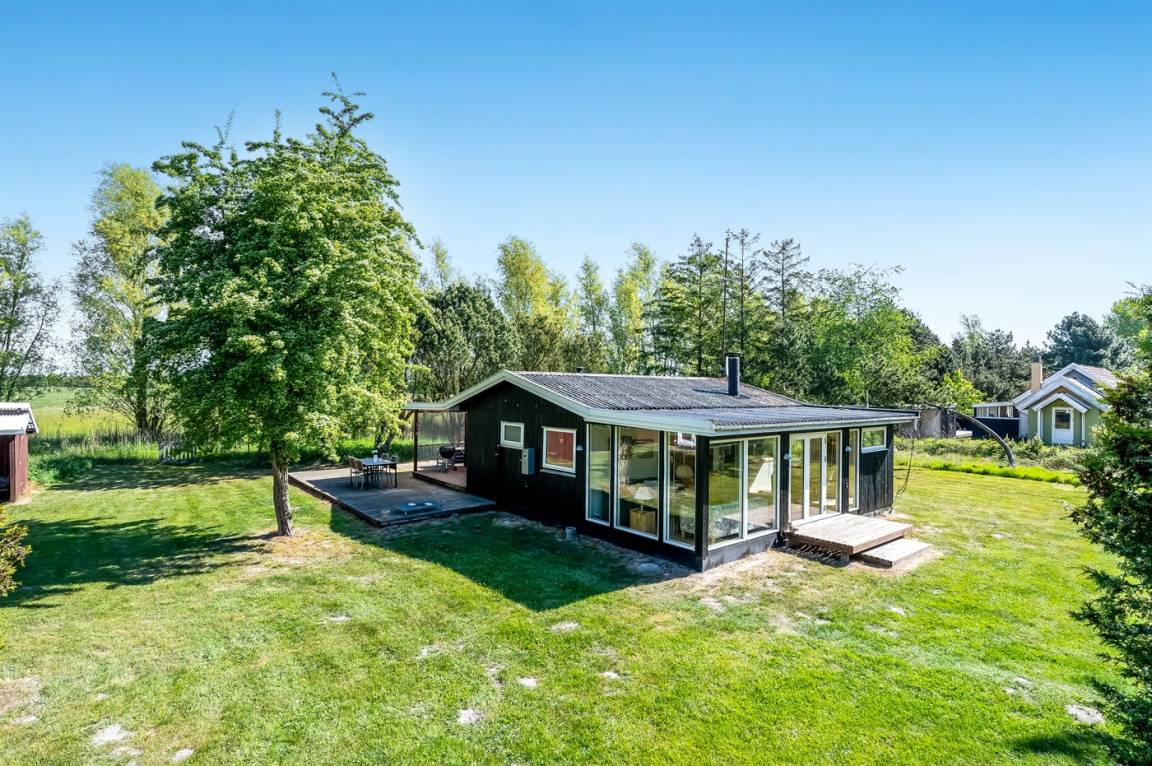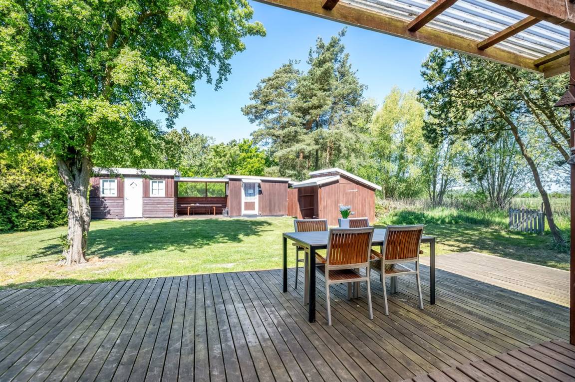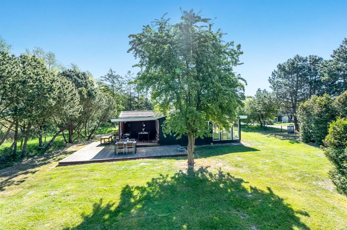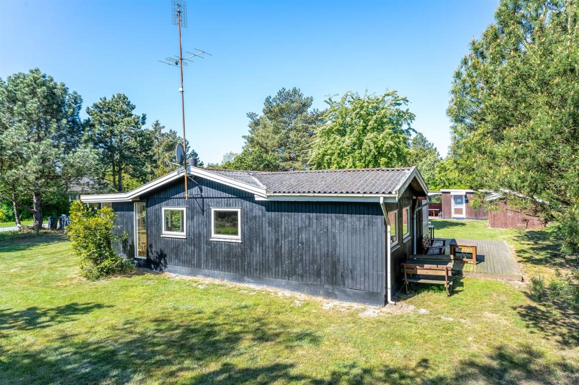 Dieses geräumige Ferienhaus liegt in ruhiger und naturschöner Umgebung, auf einem von Büschen und Bäumen umgebenen Grundstück mit Platz für Ballspiele und andere Aktivitäten im Freien. Zum Haus gerhört eine schöne, teilweise überdachte Terrasse – hier können Sie viele entspannende Stunden verbringen.
