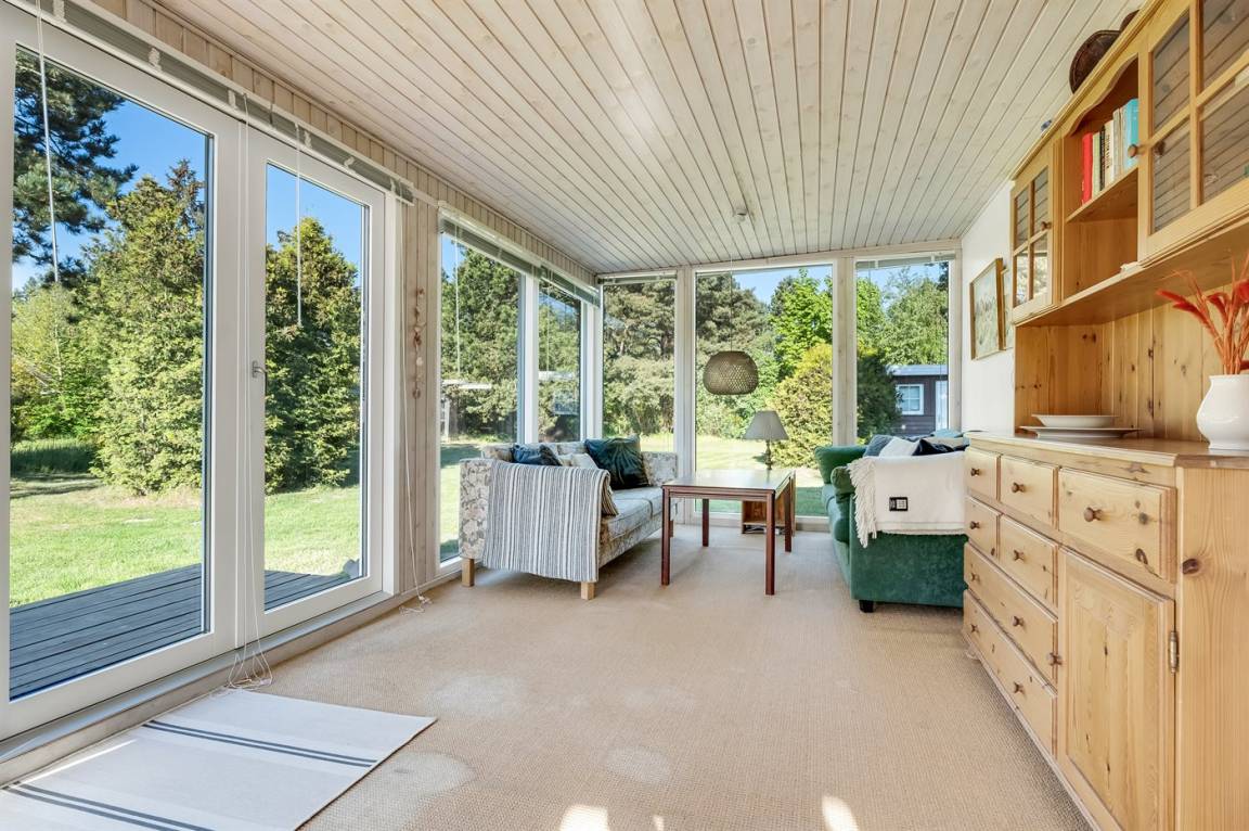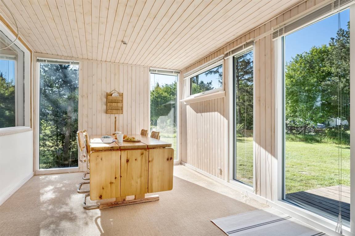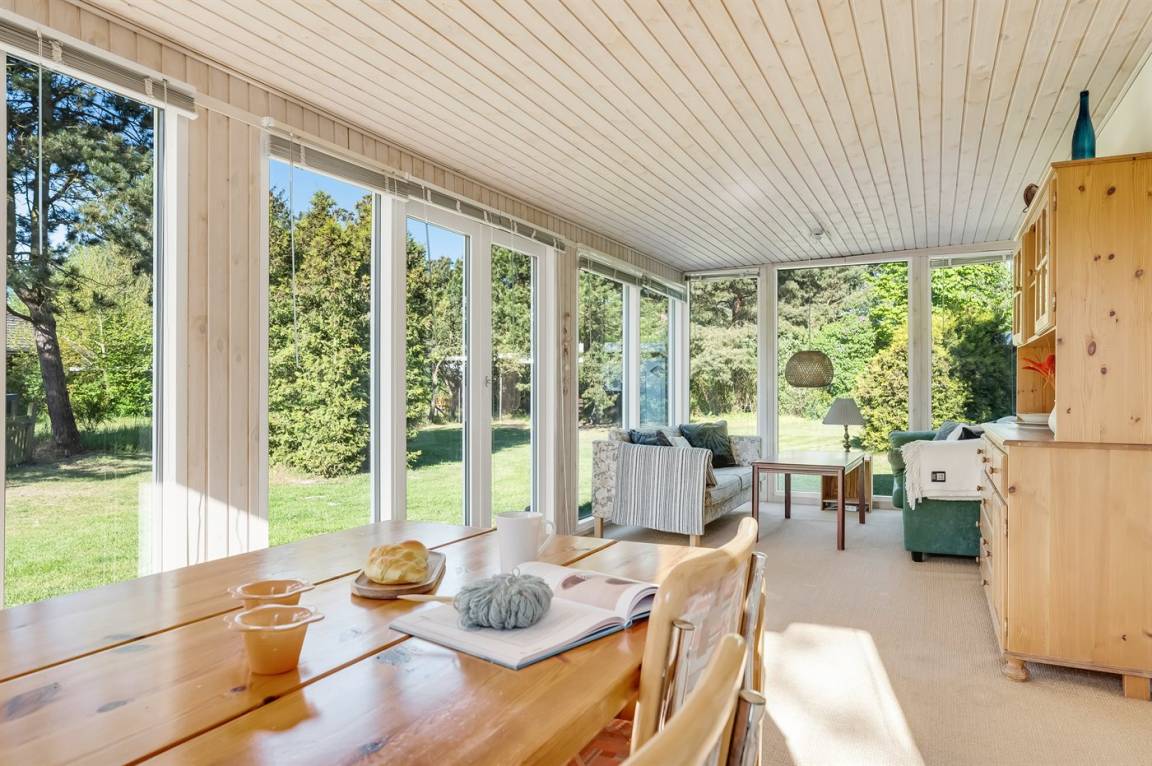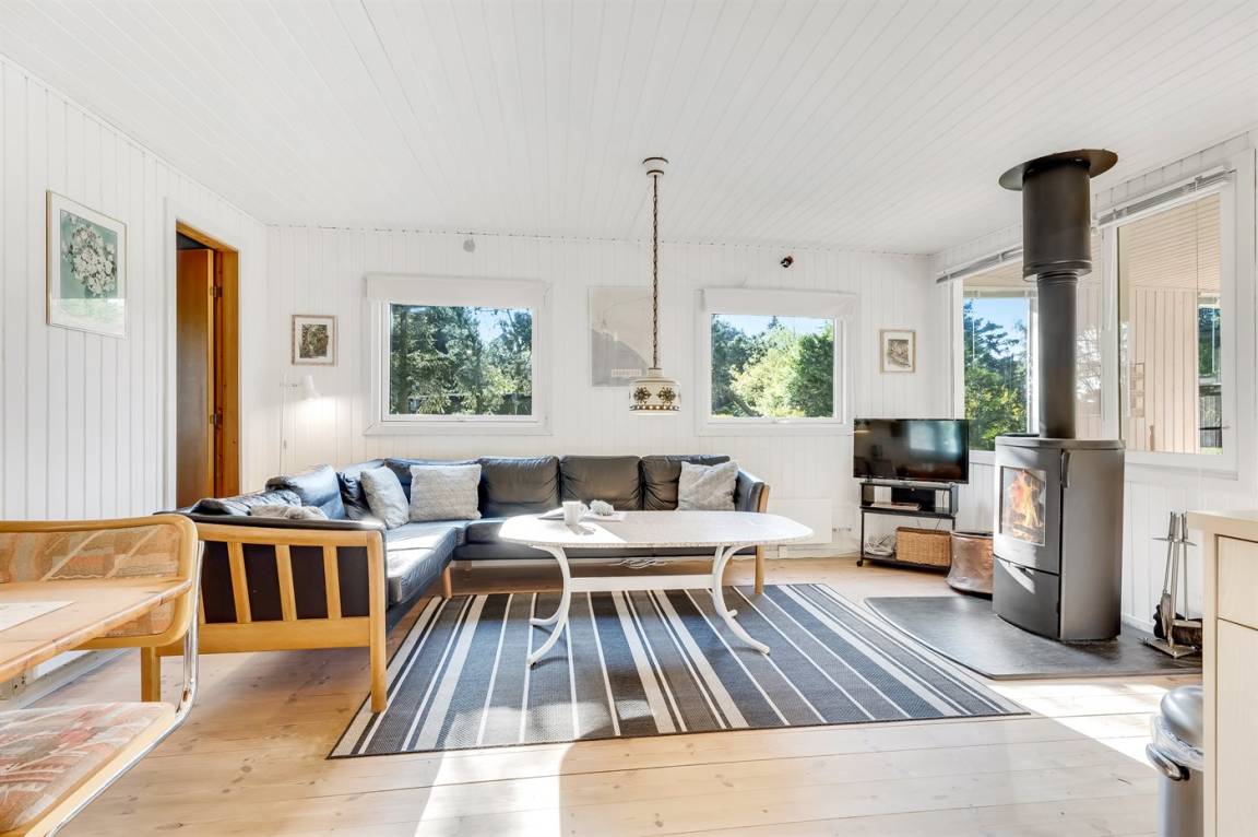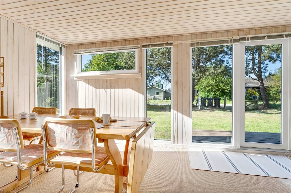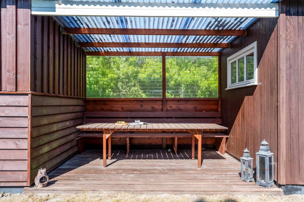 Dieses geräumige Ferienhaus liegt in ruhiger und naturschöner Umgebung, auf einem von Büschen und Bäumen umgebenen Grundstück mit Platz für Ballspiele und andere Aktivitäten im Freien. Zum Haus gerhört eine schöne, teilweise überdachte Terrasse – hier können Sie viele entspannende Stunden verbringen.