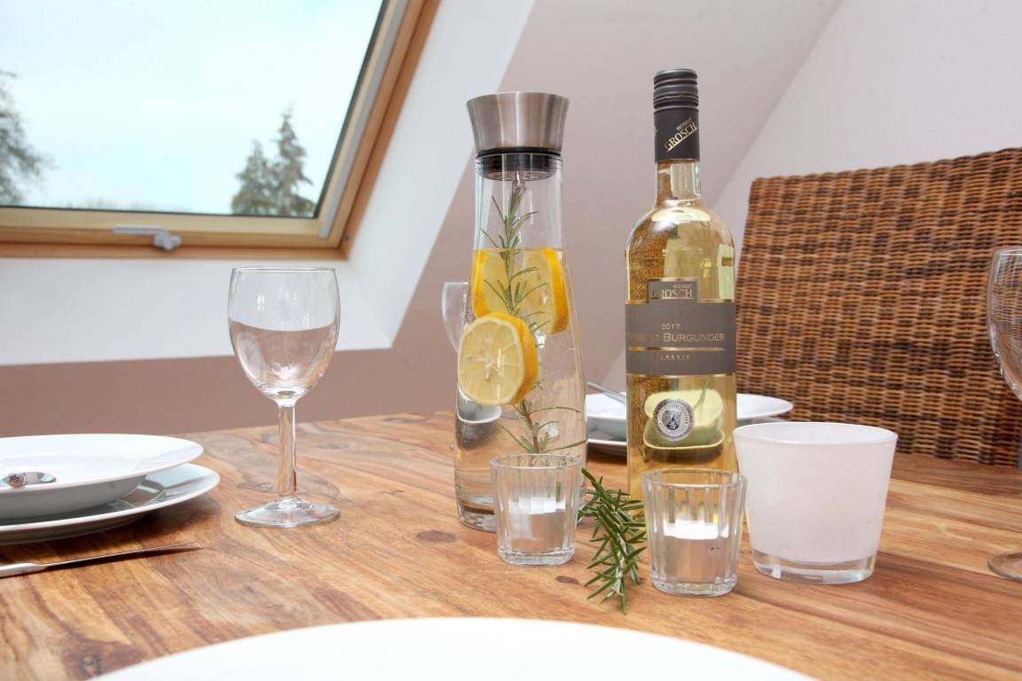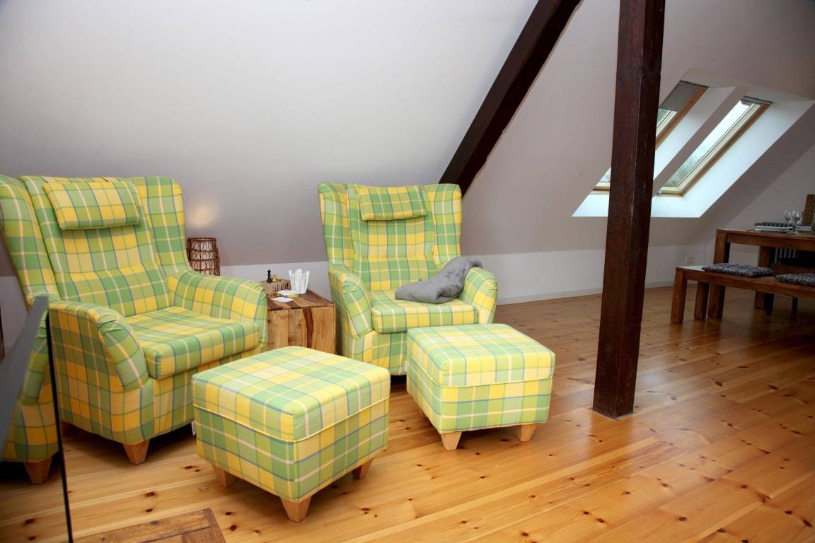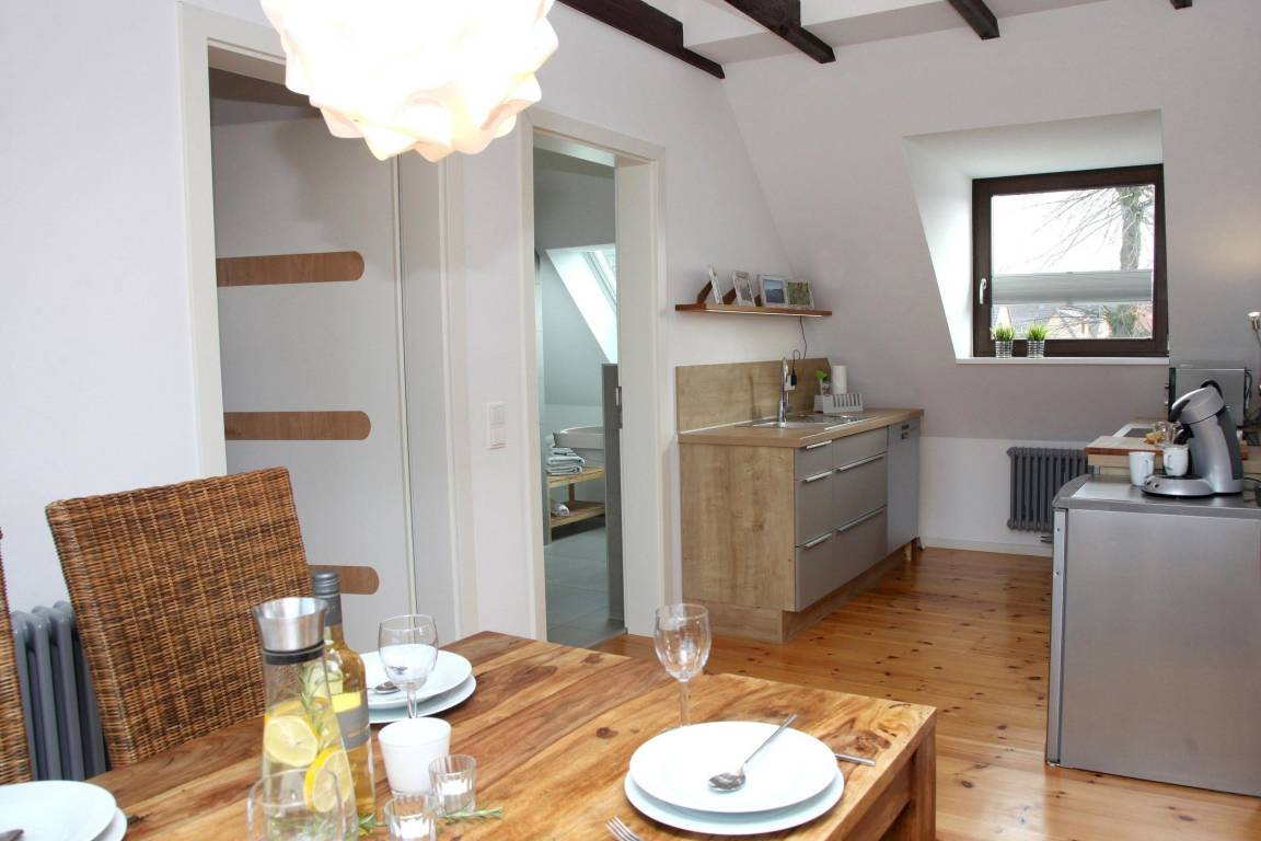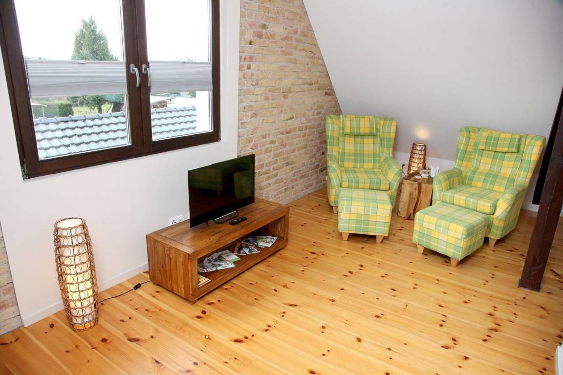 Die Ferienwohnung Utkiek im Obergeschoss eines liebevoll sanierten Hauses bietet einen lichtdurchfluteten Wohn- und Essbereich mit offener Küche, ausgestattet mit einem Induktionskochfeld, Mikrowelle, Geschirrspüler, Kühlschrank, Kaffeemaschine und Toaster. Das Schlafzimmer verfügt über zwei Einzelbetten, die sich zu einem großen Doppelbett zusammenstellen lassen. Ein Insektenschutzgitter sorgt für Komfort. Gästen steht ein Parkplatz direkt am Haus zur Verfügung sowie ein separater Raum im Nebengebäude zum sicheren Abstellen von Fahrrädern und zum Laden von E-Bikes. Der große Garten ist gemeinschaftlich nutzbar. Zusätzliche Extras wie Bettwäsche, Handtücher und Wellnessangebote können über die Gäste-App gebucht werden. Die Ferienwohnung liegt zentral und ruhig in Rechlin, nur 300 m von der Badestelle an der kleinen Müritz entfernt, und bietet ideale Voraussetzungen für zahlreiche Aktivitäten in der Natur.