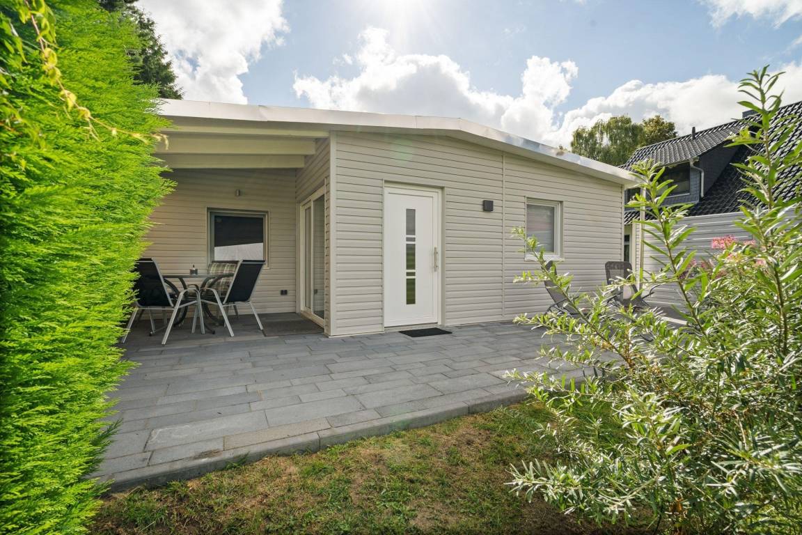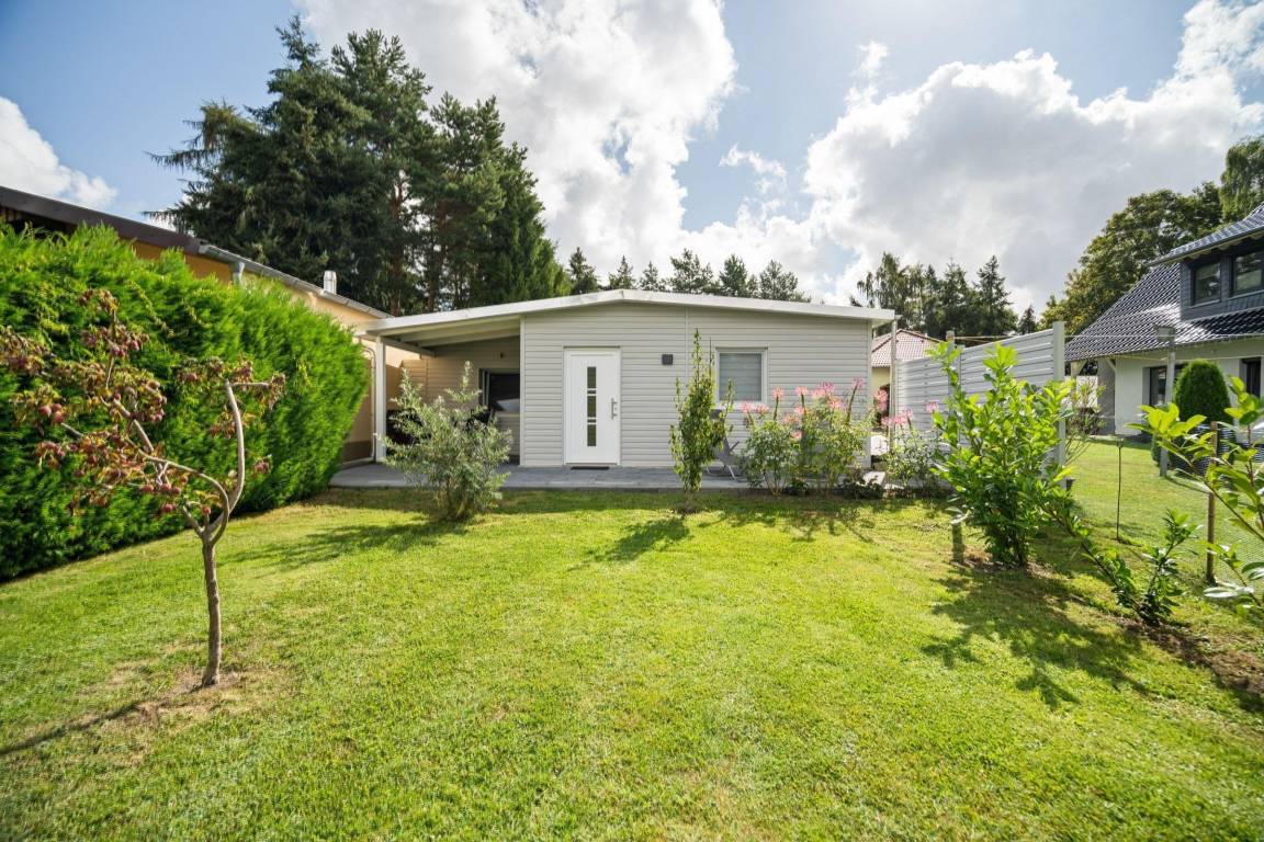 Das Ferienhaus Kira in Rechlin, ideal für bis zu drei Gäste, bietet modernen Komfort, eine überdachte Terrasse und einen idyllischen Garten – perfekt für erholsame Tage in ländlicher Umgebung.