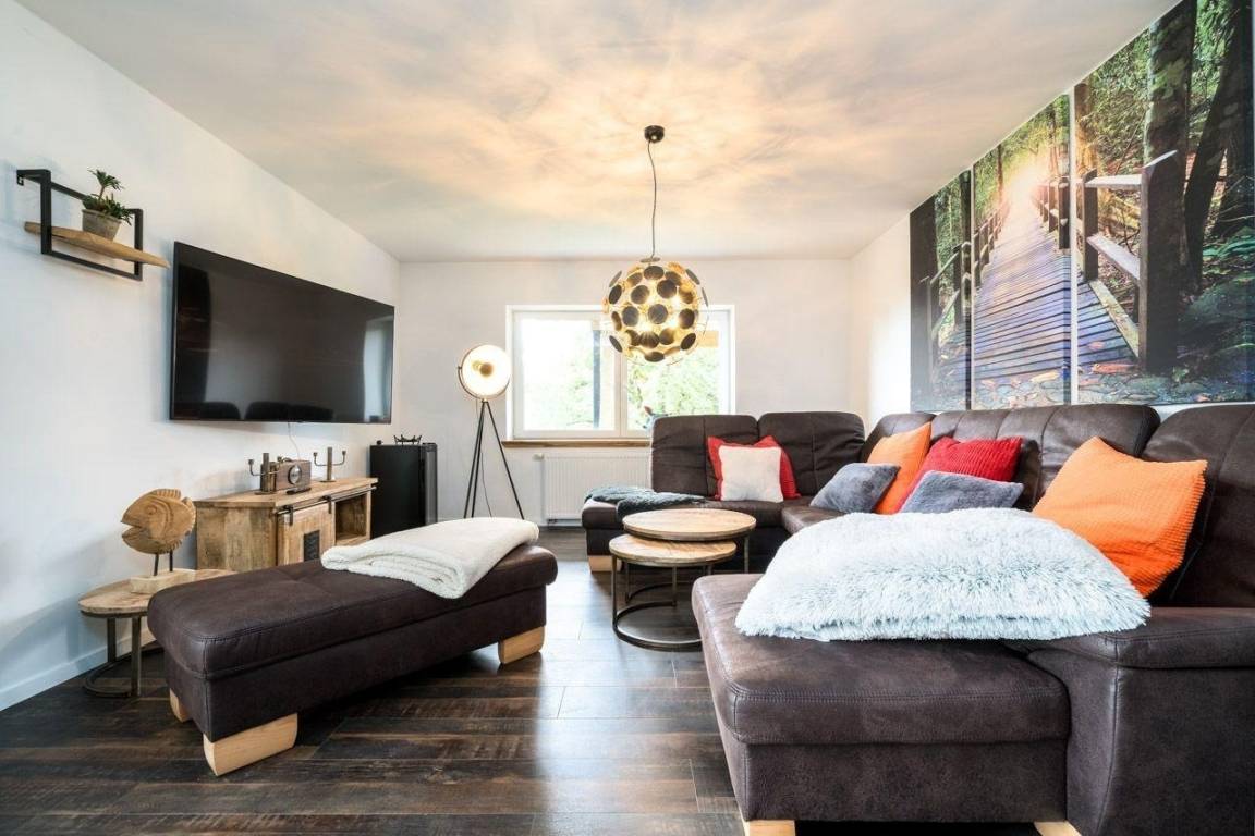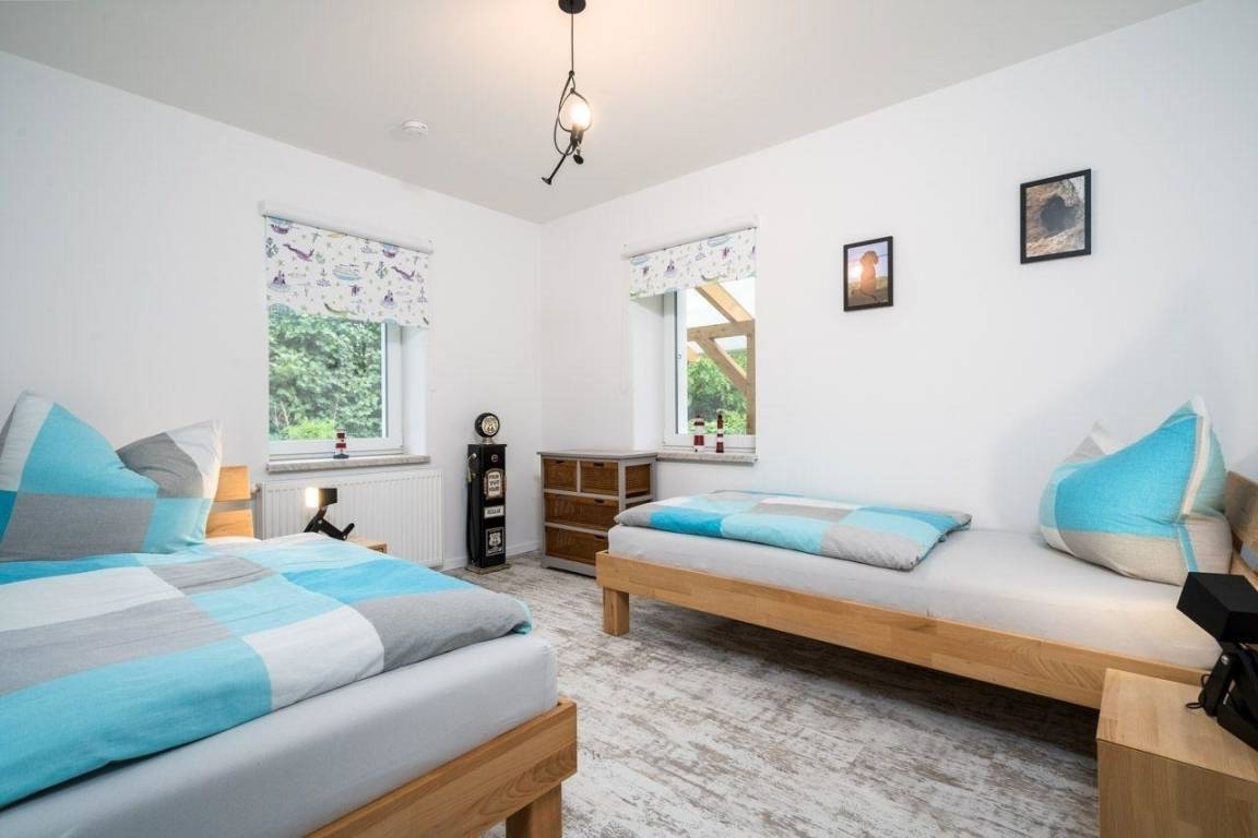 Die modern ausgestattete, haustierfreundliche Ferienwohnung verfügt über drei Schlafzimmer und eine voll ausgestattete Küche. Die Sauna kann gegen Aufpreis genutzt werden. Eine gemeinschaftliche Terrasse und ein Grillplatz stehen zur Verfügung. Bettwäsche und Handtücher sind nicht im Preis enthalten. Haustiere sind willkommen, jedoch sind die Ferienwohnungen nicht durch einen Zaun getrennt. Die Anreise erfolgt über den vereinbarten Termin zur Schlüsselübergabe. Gäste können Parkplätze auf dem Grundstück nutzen, sollten jedoch Abstimmungen mit anderen Mietern treffen.