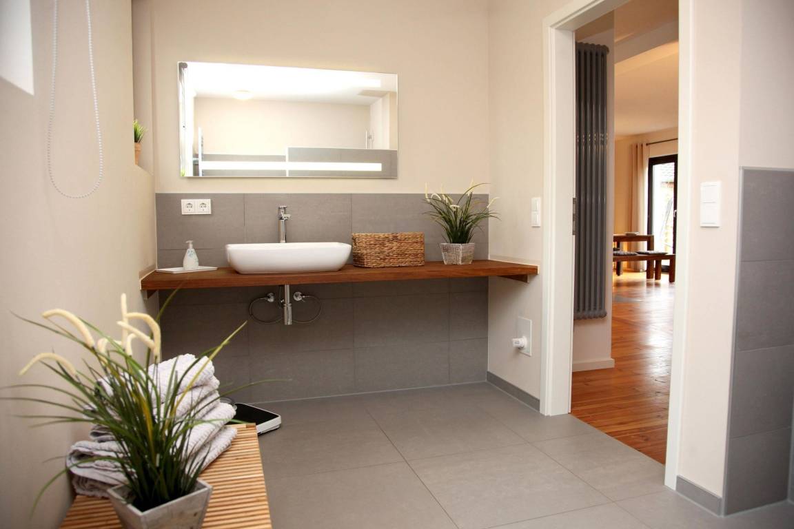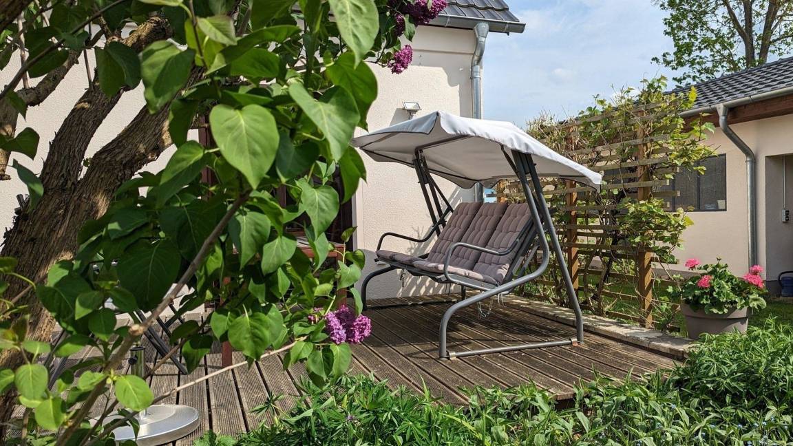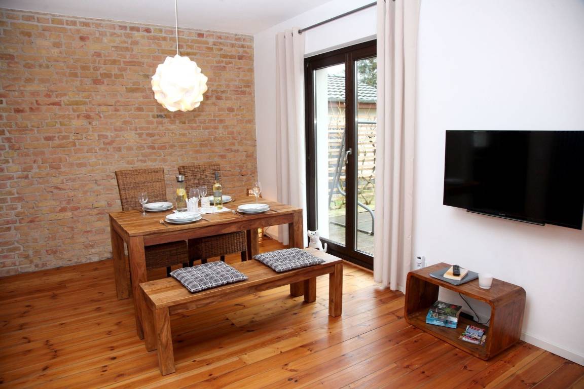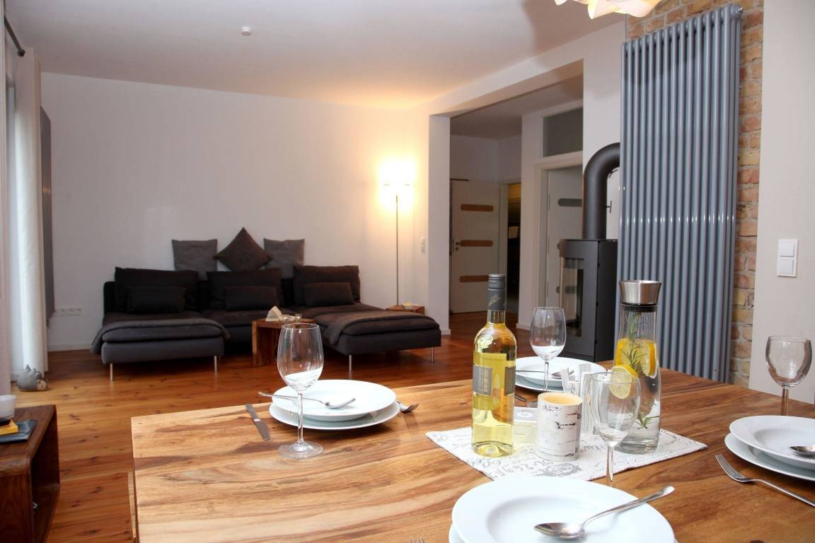 Die stilvolle Ferienwohnung in Rechlin erstreckt sich über das gesamte Erdgeschoss eines liebevoll sanierten Hauses. Auf großzügigen 75 m² bieten ein etwa 30 m² großer Wohnraum und eine halboffene Küche mit modernster Ausstattung, darunter ein Induktionskochfeld, Backofen, Spülmaschine und Kühlschrank, höchsten Komfort. Ein elegantes Schlafzimmer mit begehbarem Kleiderschrank und ein geräumiges Duschbad runden das Angebot ab. Die Wohnung ist mit WLAN und einem Kaminofen ausgestattet. Zusätzlich befindet sich im Nebengebäude ein Raum zum sicheren Abstellen von Fahrrädern, der ebenfalls für das Laden von E-Bikes genutzt werden kann. Gemeinsam genutzte Gartenmöbel sowie eine Terrasse laden zum Entspannen ein. Der Parkplatz liegt direkt am Objekt. Bedienelemente wie Bettwäsche und Handtücher sind nicht im Preis enthalten, können jedoch hinzugebucht werden.