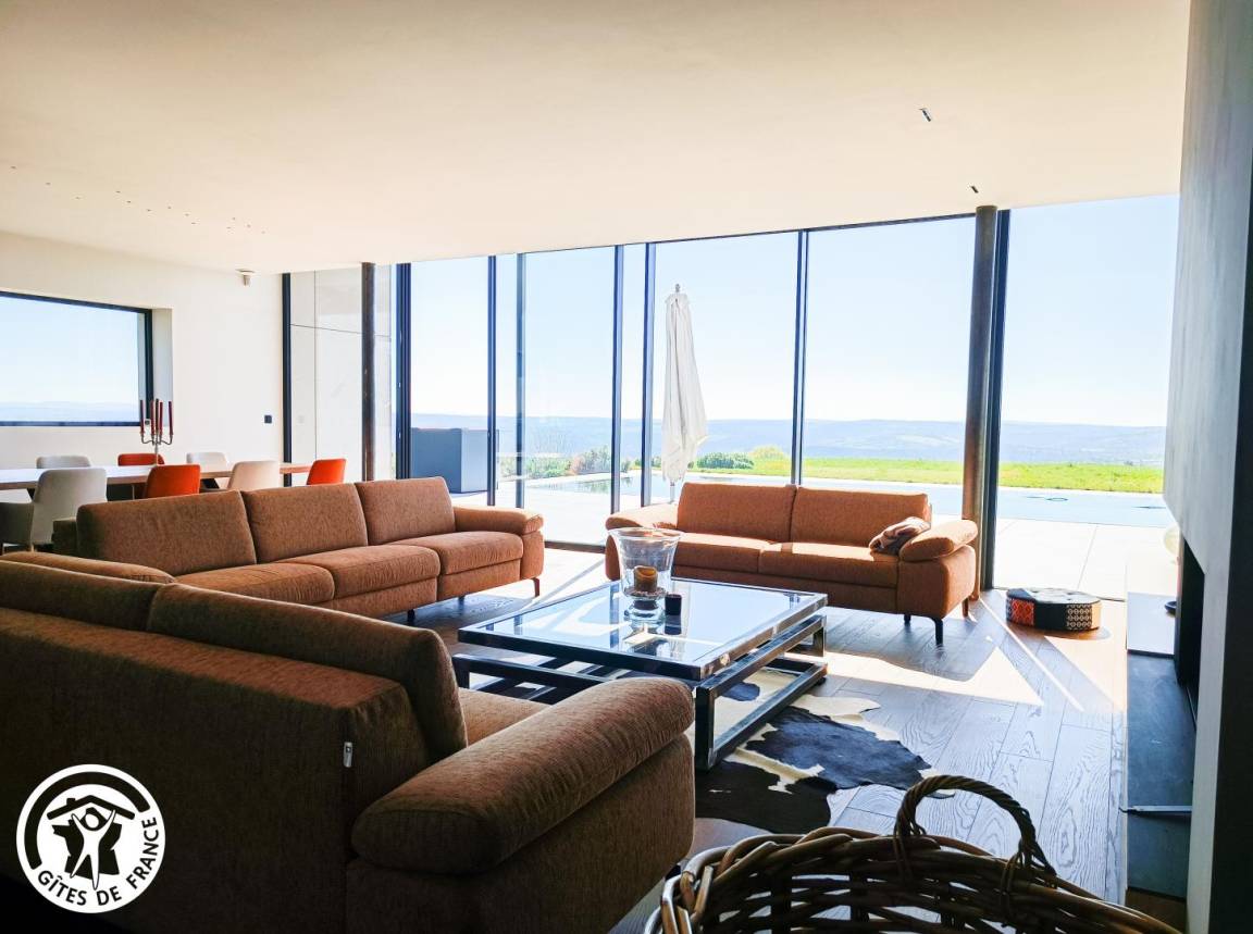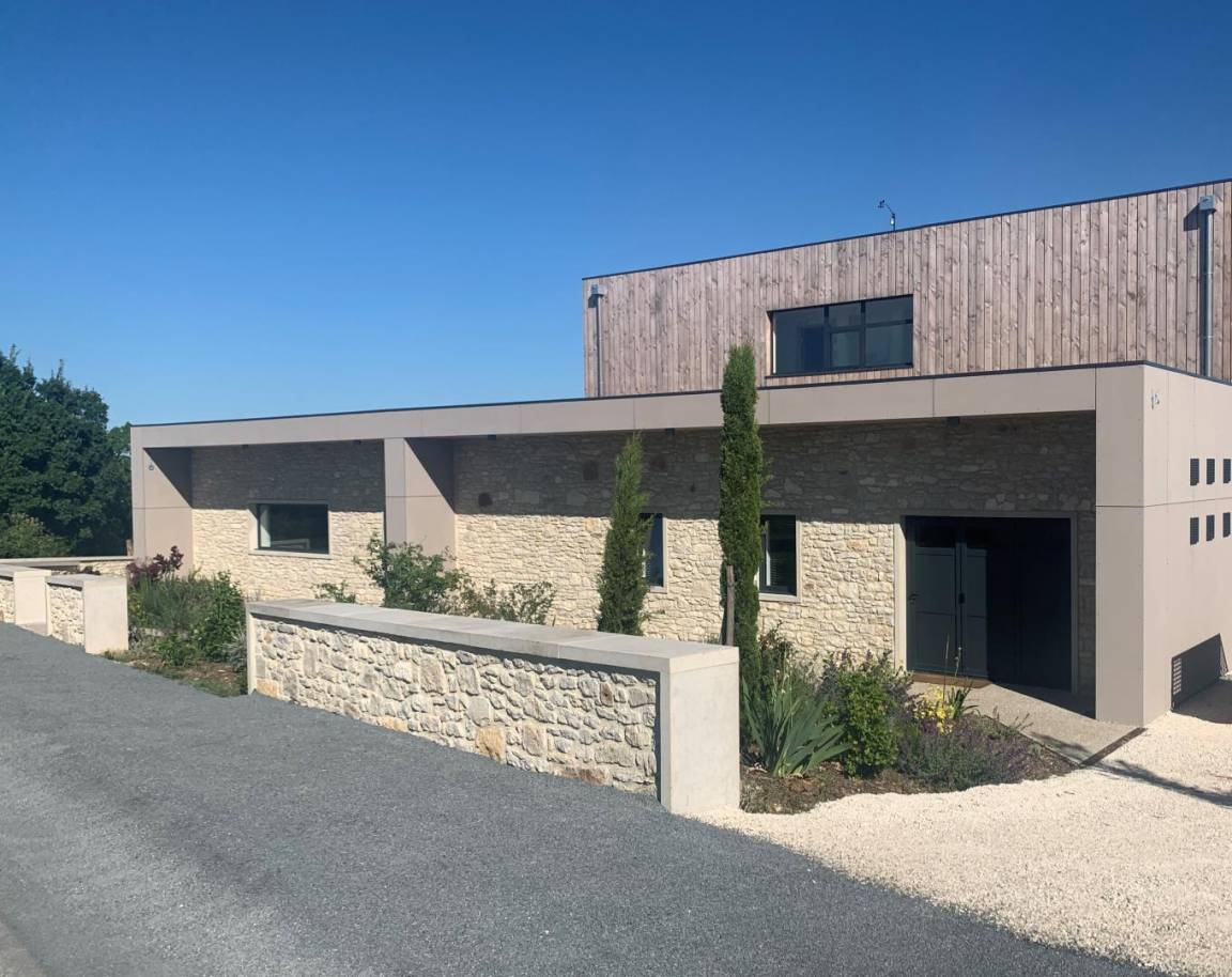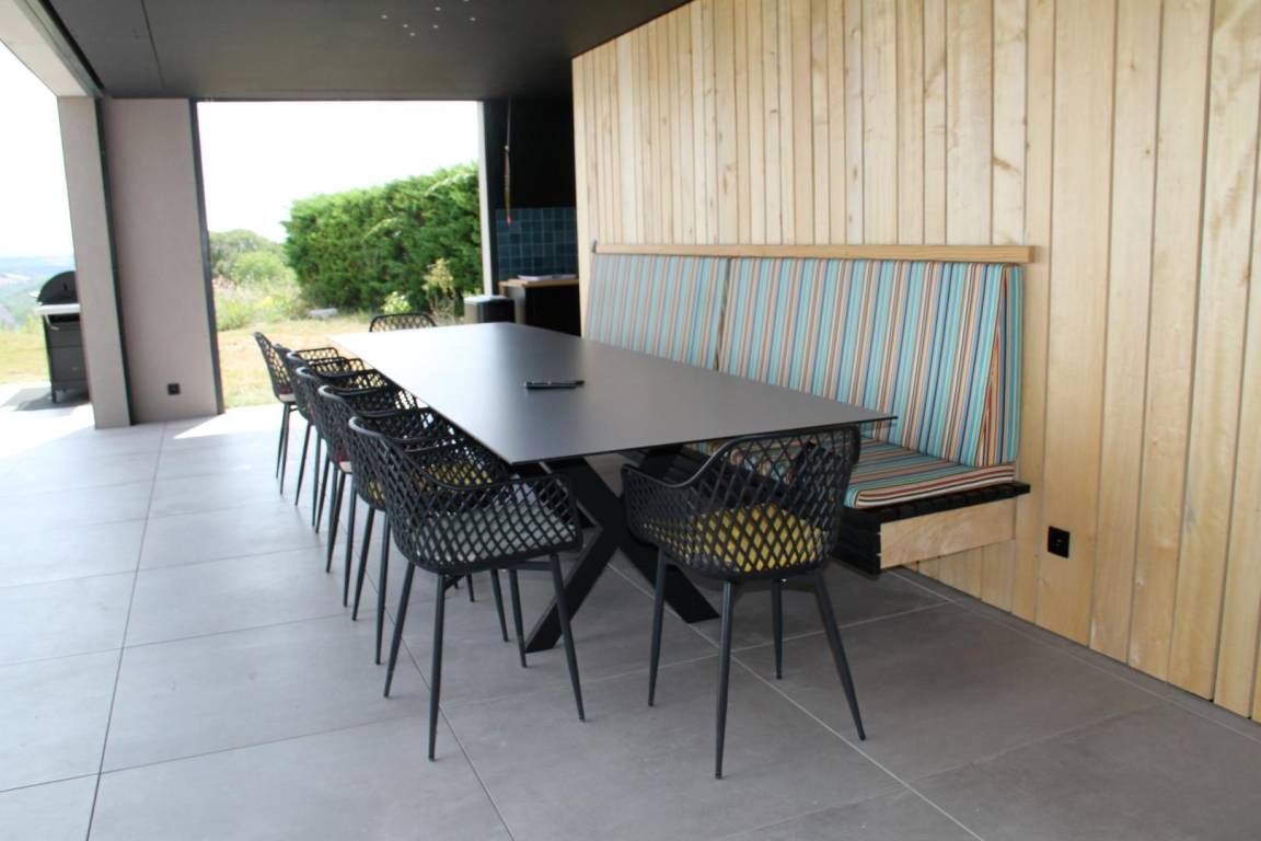 „La vue préemptée sur le Causse est exceptionnelle, elle surplombe les qualités de ce bâti puissamment original, fonctionnel et sobre qui sort de l'épure. Faire lieu à Reilhaguet est une expérience apaisante. "Impose ta chance, serre ton bonheur" et aucun risque !“
