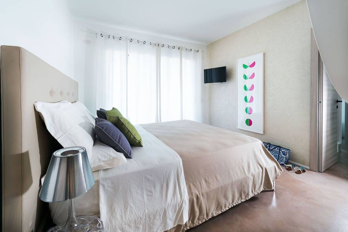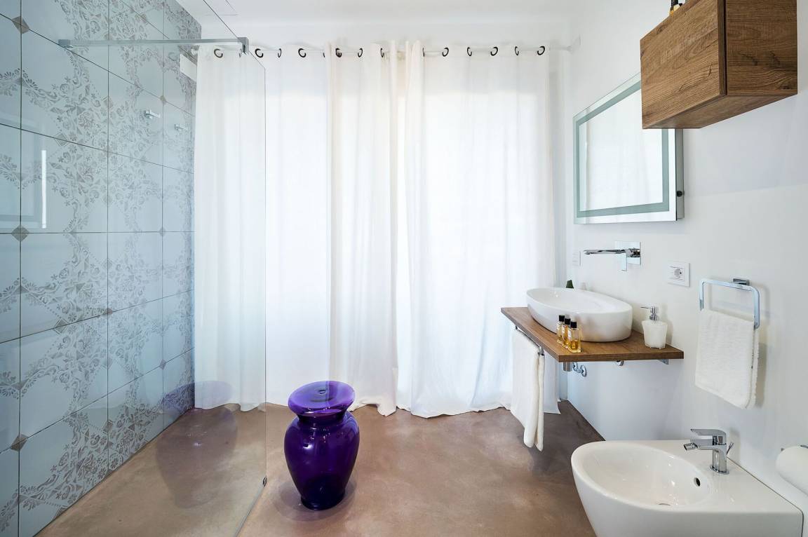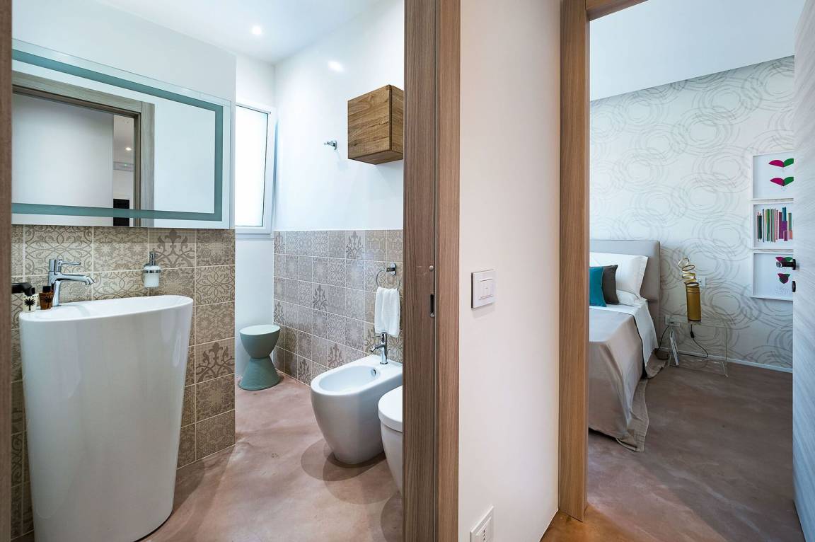 Schlafzimmer mit Bad 1: großes Doppelbett, Internet, Klimaanlage, Waschbecken, WC, Bidet, Dusche.