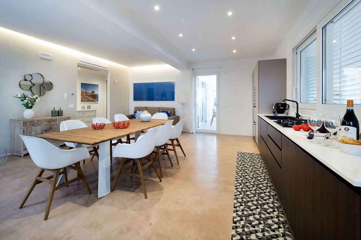 Wohnküche: Esstisch, Spülmaschine, Kühlschrank, Tiefkühler, Mikrowelle, Herd, Ofen, Toaster, Italienische Kaffeemaschine, Amerikanische Kaffeemaschine, Sofa, WiFi Internet, Internet, Klimaanlage, Satelliten-TV, TV.