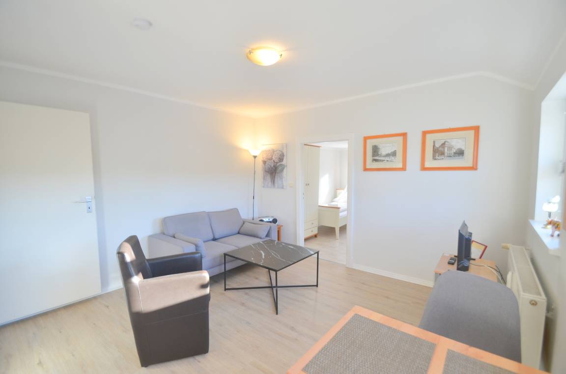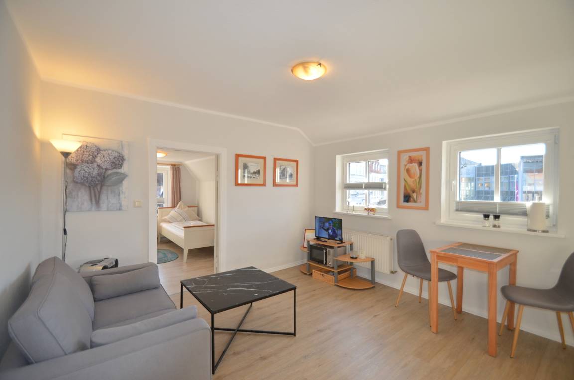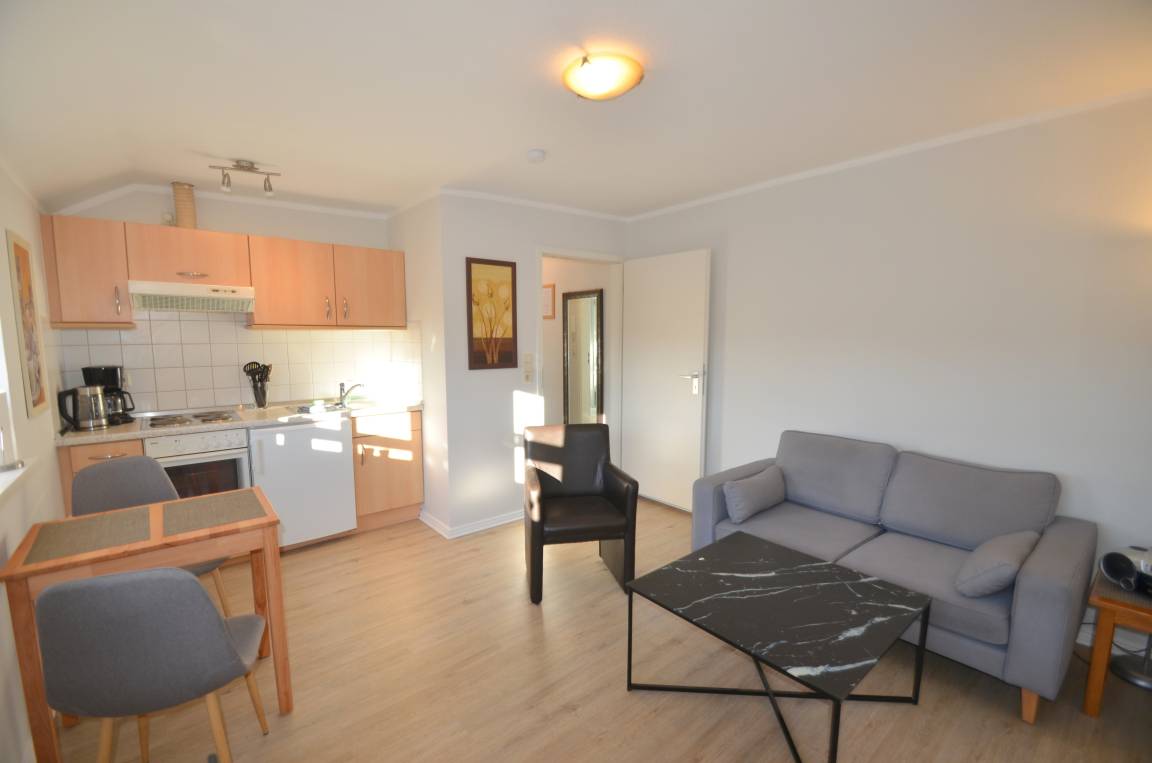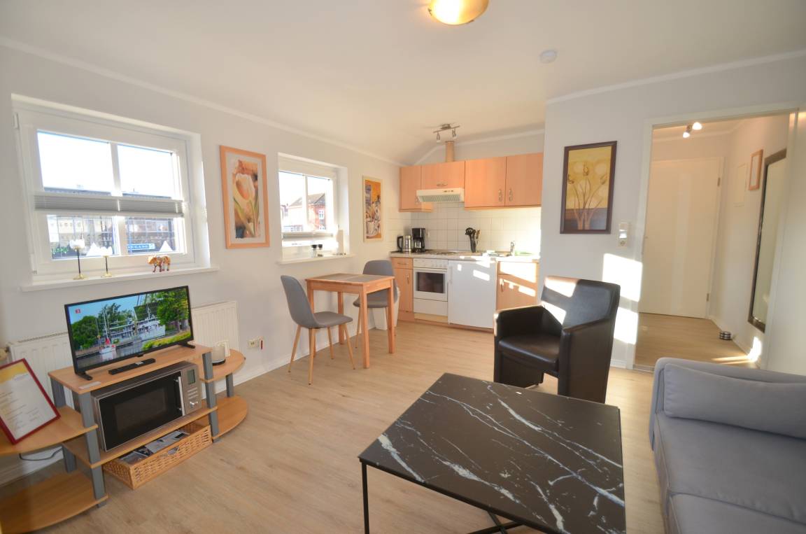 Die Wohnung "Hafen" im Gästehaus am Schiffbrückenplatz verfügt über ein Schlafzimmer mit zwei Einzelbetten, einen Wohnraum mit integrierter Küchenzeile, zwei Sessel mit Couchtisch, Esstisch, Flur und ein Duschbad. Zusammen bieten diese Räumlichkeiten auf etwa 40 m² im 2. Obergeschoss auch für längere Aufenthalte ein behagliches Wohngefühl.