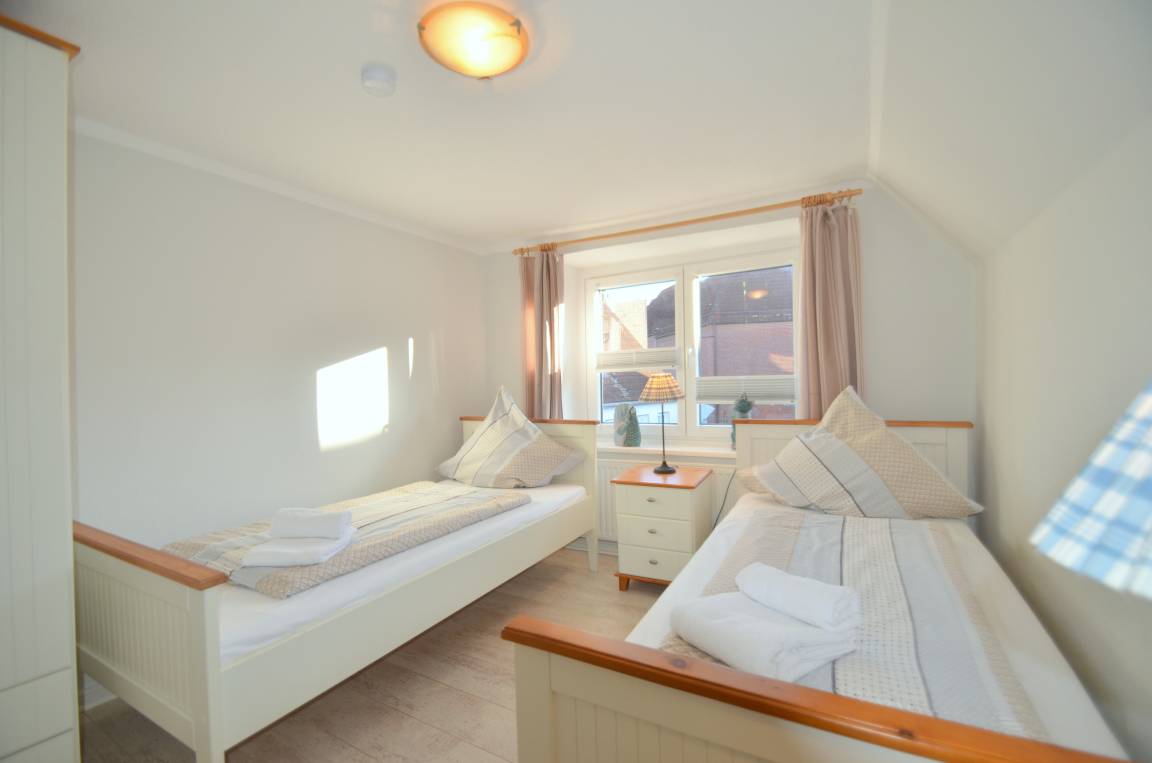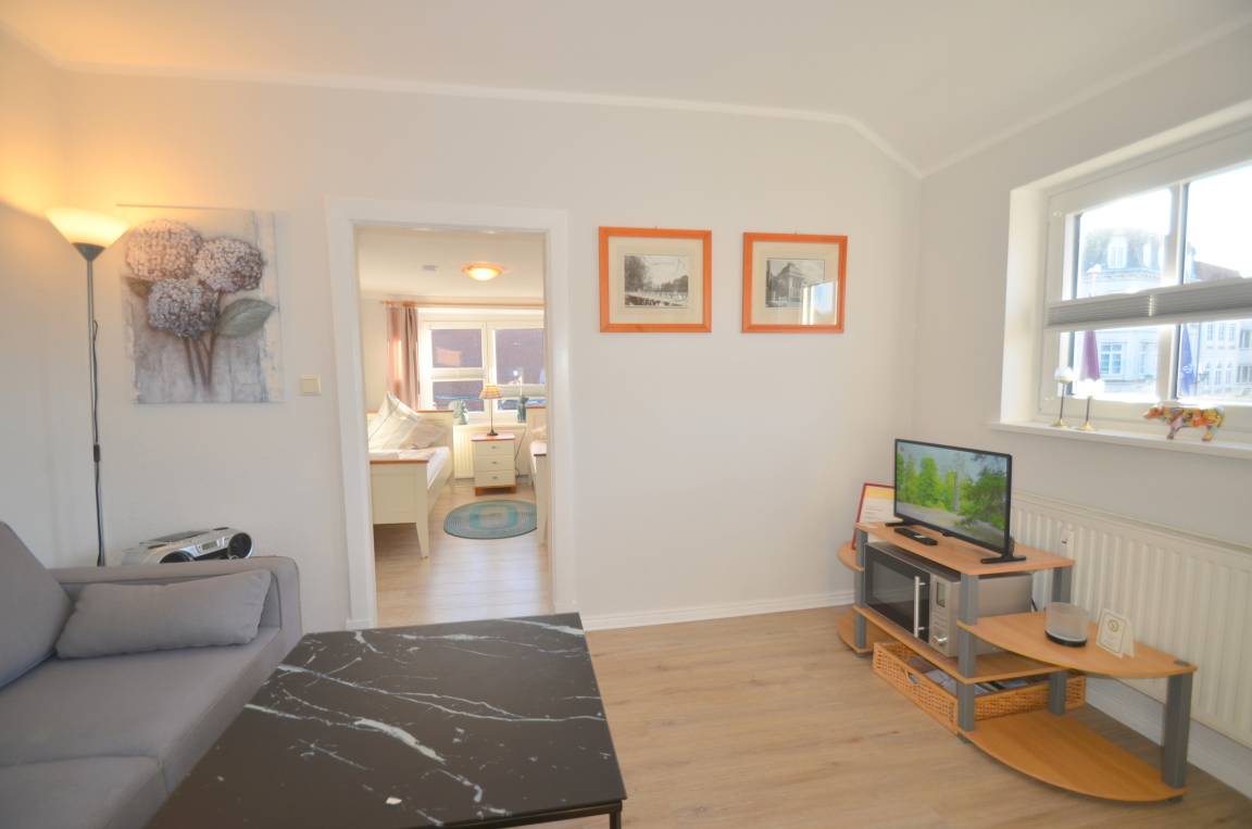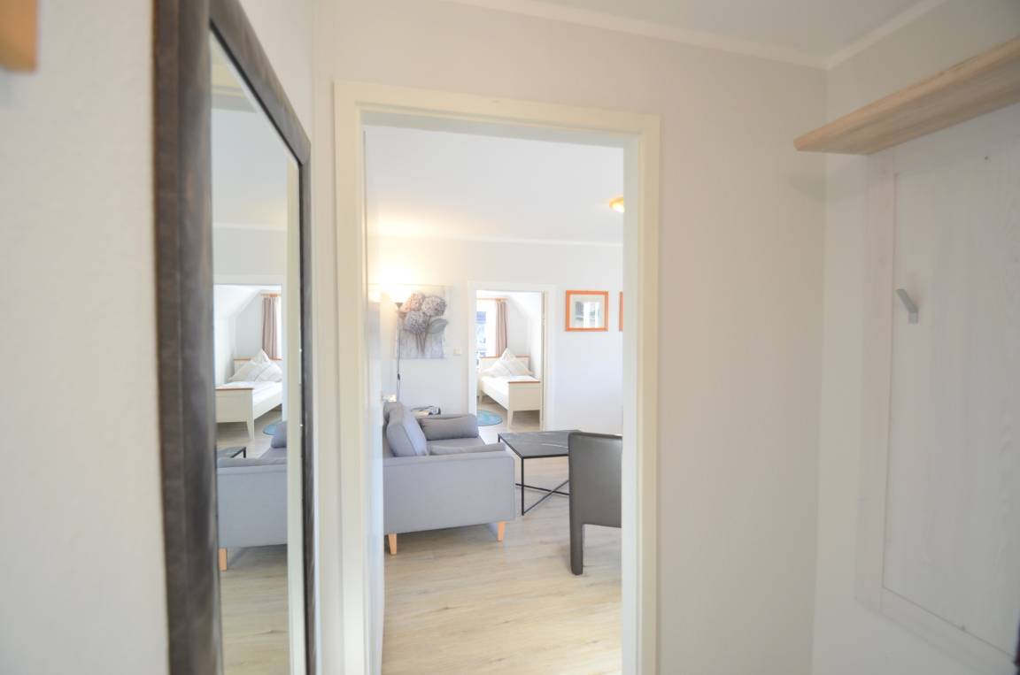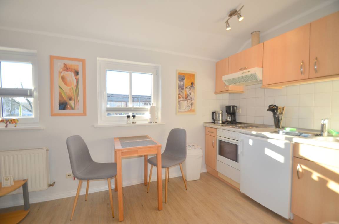 Die Wohnung "Hafen" im Gästehaus am Schiffbrückenplatz verfügt über ein Schlafzimmer mit zwei Einzelbetten, einen Wohnraum mit integrierter Küchenzeile, zwei Sessel mit Couchtisch, Esstisch, Flur und ein Duschbad. Zusammen bieten diese Räumlichkeiten auf etwa 40 m² im 2. Obergeschoss auch für längere Aufenthalte ein behagliches Wohngefühl.