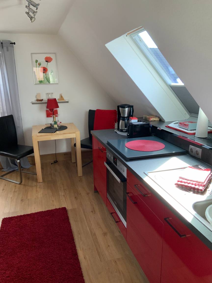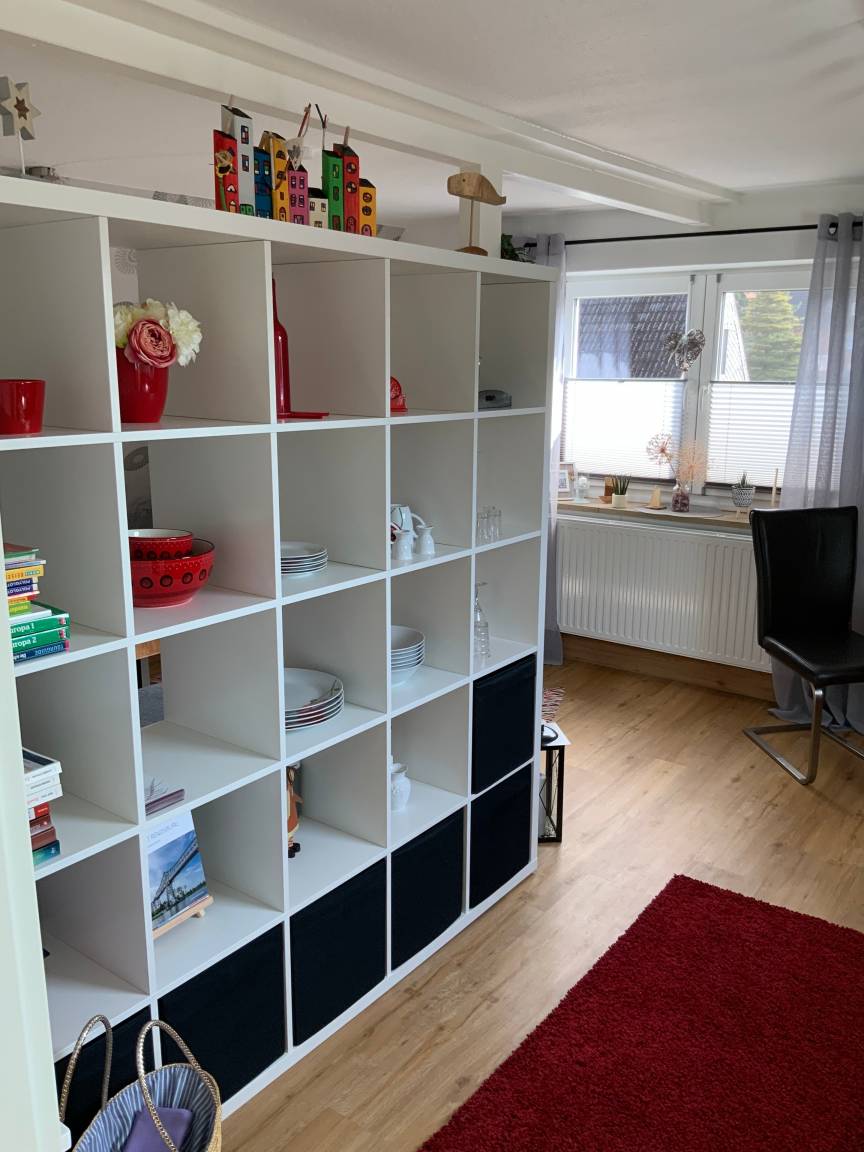 Die Ferienwohnung hat einen eigenen Eingang. Die voll ausgestattete Küchenzeile lädt zum Kochen ein und hier befindet sich auch der Esstisch mit zwei Stühlen. Der gemütliche Wohnbereich mit einer Sitzgarnitur und einem internetfähigen Fernseher ist durch ein offenes Regal vom Küchenbereich abgetrennt. Eine Stereoanlage und ein WLAN-Gastzugang stehen ebenfalls zur Verfügung. Im Schlafzimmer erwartet Sie ein komfortables Boxspringbett (180 x 200 cm).