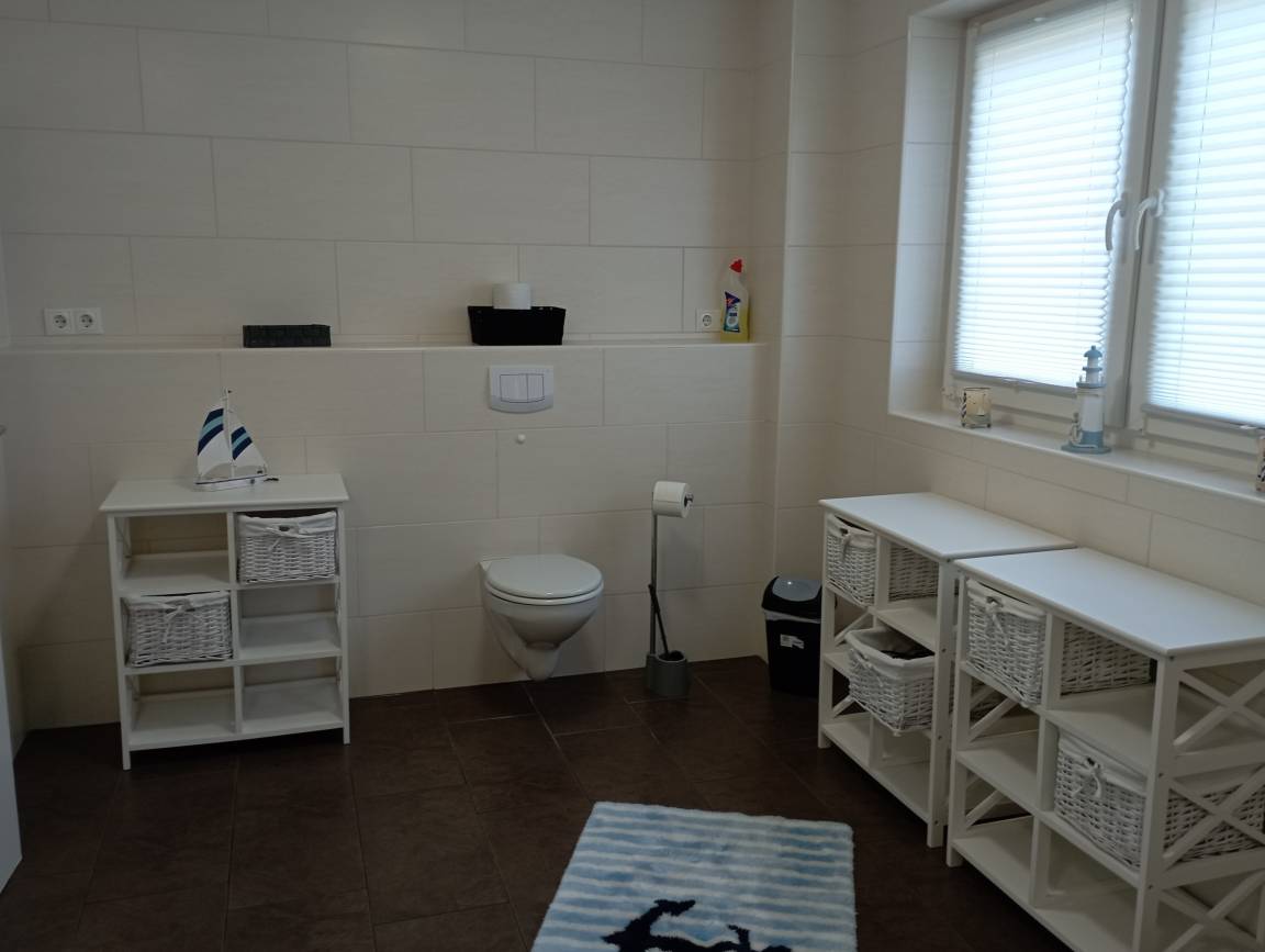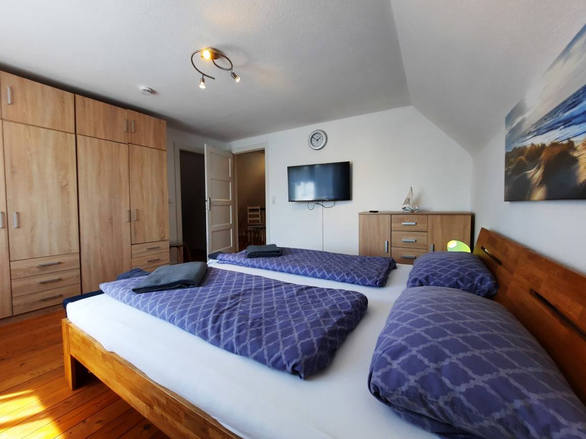 Das Ferienhaus verfügt über vier Schlafzimmer und zwei voll ausgestattete Badezimmer. Im Erdgeschoss befindet sich ein Schlafzimmer für zwei Personen, das wahlweise mit einem Doppelbett oder zwei Einzelbetten eingerichtet werden kann. Ebenso befindet sich im Erdgeschoss ein barrierearmes Duschbad, das auch für Gäste mit eingeschränkter Mobilität geeignet ist. Im Obergeschoss liegen drei weitere Schlafzimmer. Ein Zimmer ist für zwei Personen vorgesehen, zwei weitere Zimmer bieten Platz für jeweils drei Personen. Alle Betten können je nach Wunsch als Einzel- oder Doppelbetten gestellt werden. Die gewünschte Konfiguration kann im Vorfeld mit dem Gastgeber abgestimmt werden.