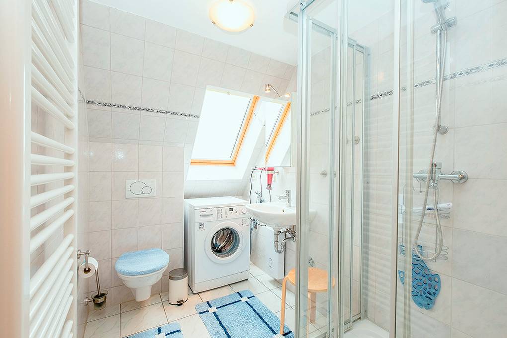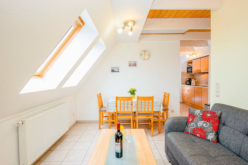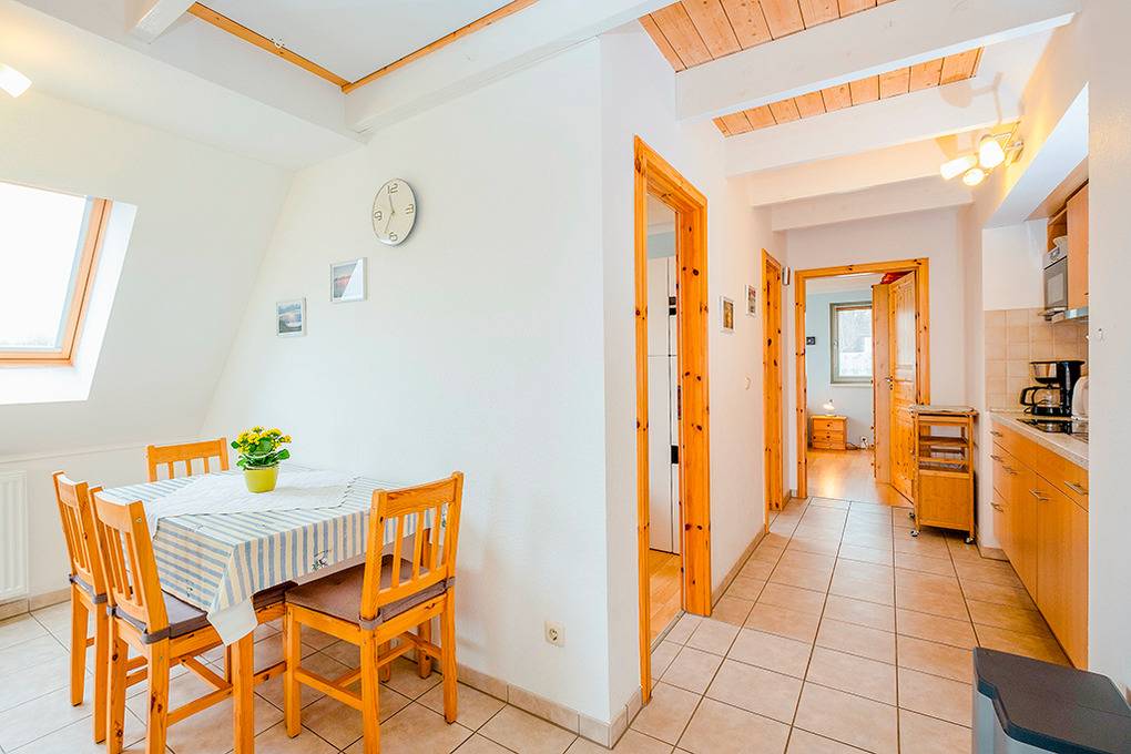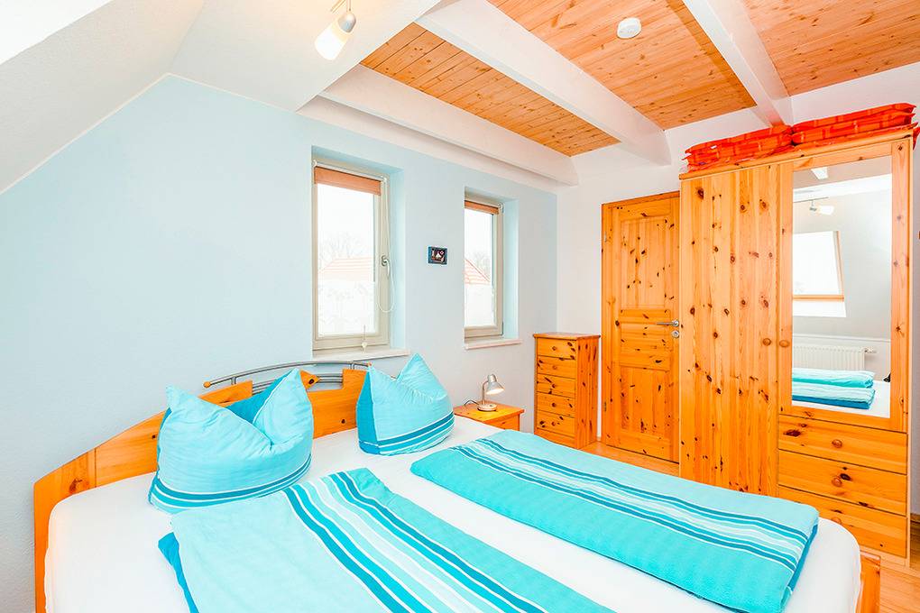D 132.27 Wohnung 2-4 Pers.: 3-Zimmerwohnung mit 45 qm Wohnfläche, 1. Etage (Dachschrägen): Wohn-/Essraum mit Couchgarnitur, Sat-TV, Radio/CD, Esstisch, Einbauküche (Mikrowelle, Spülmaschine). Doppelzimmer. Kleines 2-Bettzimmer mit Einzelbett, Ausziehbett. Bad/WC mit Waschmaschine. Klapptreppe in den Spitzboden: Spiel- und Ruheraum mit Einzelmatratzen, schönem Wasserblick. Balkon mit Blick aufs Salzhaff.