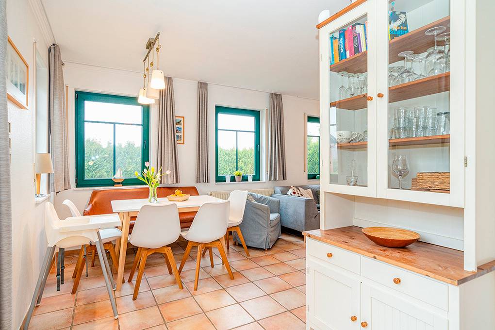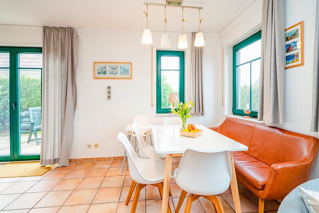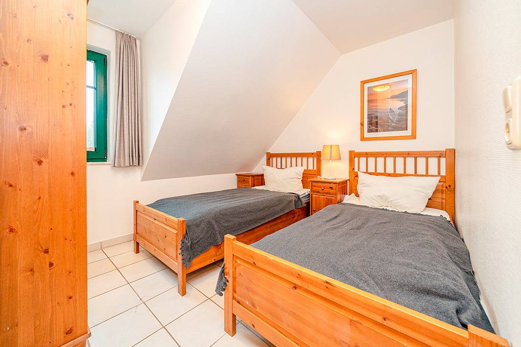 D 132.6 Ferienhaus 3-6 Pers.: 4-Zimmerhaushälfte mit 80 qm Wohnfläche über 2 Etagen. Parterre: Lichtdurchfluteter Wohnraum mit Kaminofen, gemütlicher Sitzecke, Sat-TV, Stereoanlage, Esstisch. Küchenbereich, offen zum Wohnraum mit moderner Einbauküche (Backofen, Spülmaschine, Mikrowelle). Bad: Du, Wb, WC, Waschmaschine, Infrarotsauna. 1. Etage (leichte Schrägen): Schönes Doppelzimmer. Weiteres Doppelzimmer. 1-Bettzimmer, zweiter Schlafplatz auf Ausziehbett vorhanden. Sep. WC.