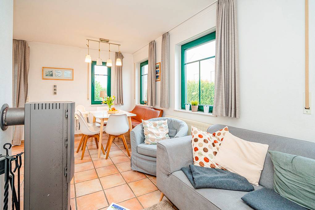 Haus: Zwei komfortable, nahezu identische Doppelhaushälften mit Sauna. Schöner Wohnbereich mit Kaminofen, sehr geschmackvolle Einrichtung. Zentralheizung. Kostenloser Internetzugang über Wlan (über LTE). West-Terrasse, Garten mit Sitzmöbeln, Grill (bei D 132.6). Gartenhaus für Fahrräder. D 132.6 als Nichtraucherhaus, zusätzlich mit Fußbodenheizung, zweiter Terrasse (Süd-Ost).