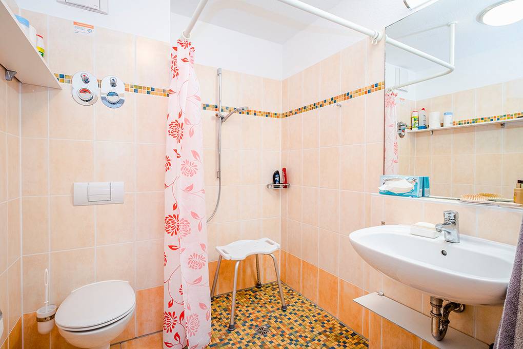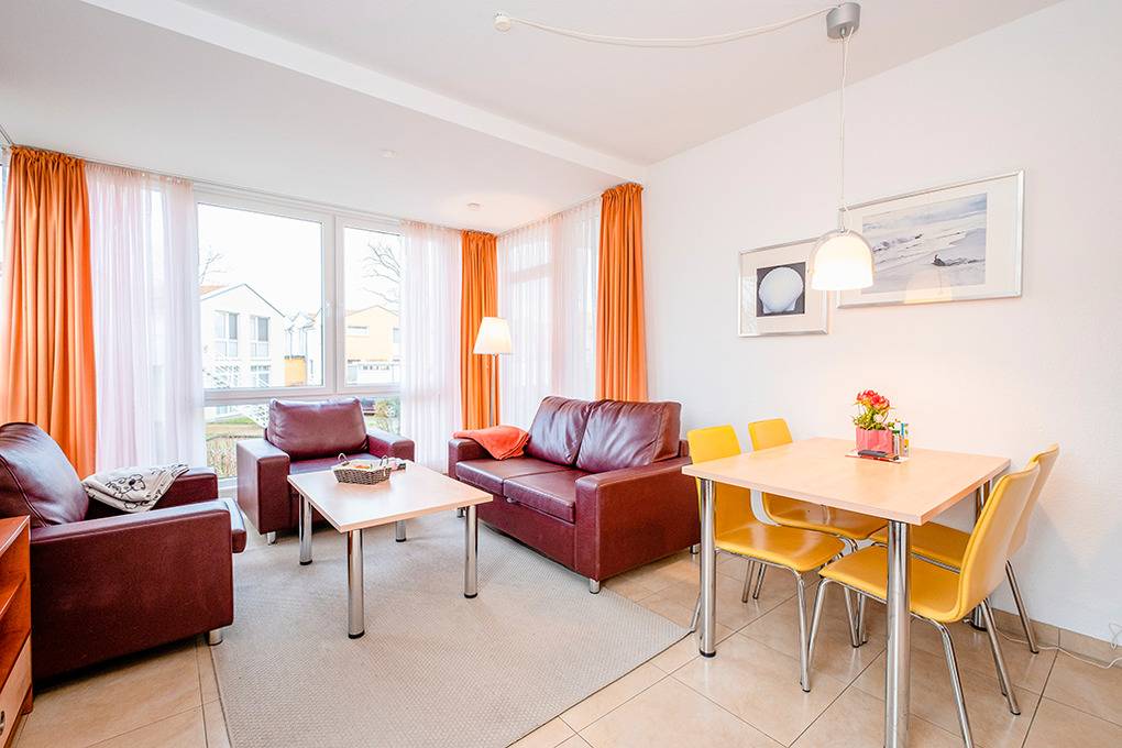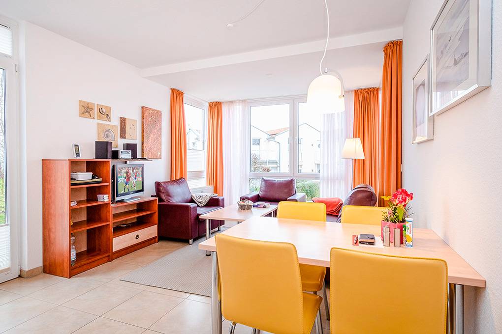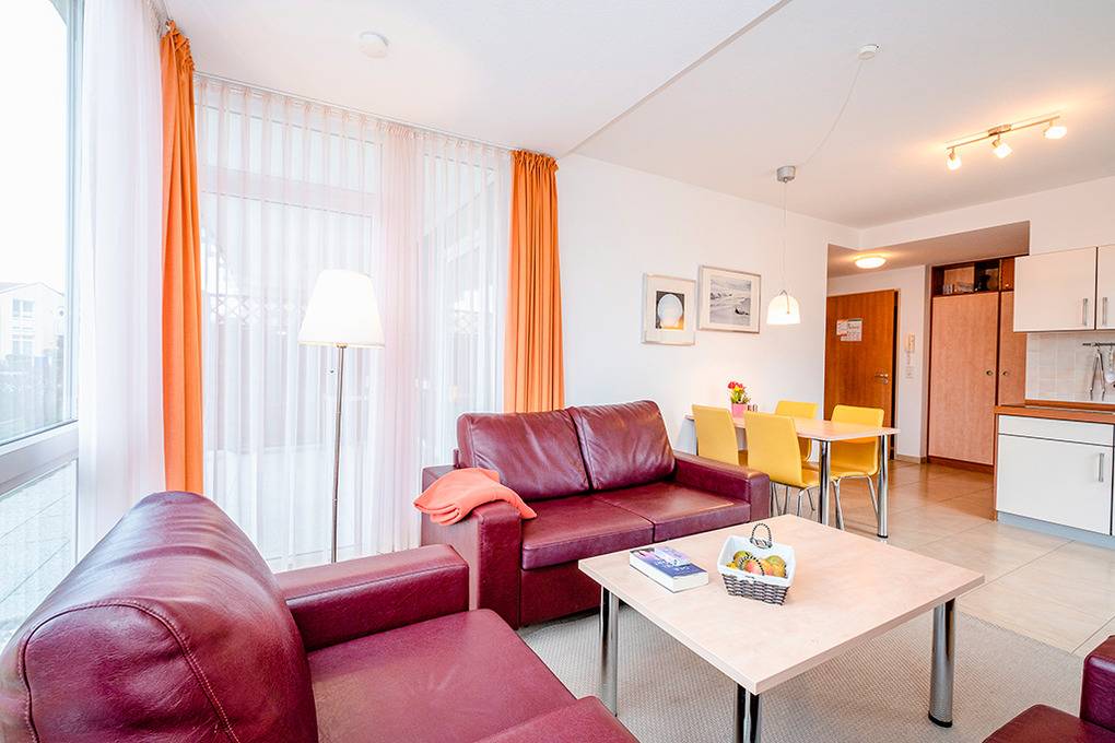 D 132.72B Wohnung 2-4 Pers.: 3-Zimmerwohnung, 55 qm Wohnfläche, Parterre. Wohn-/Essraum mit Couchgarnitur, Esstisch, Küchenzeile. Doppelzimmer. 2-Bettzimmer mit Etagenbett. Bad/WC. Zwei Terrassen: nach Süden und überdacht nach Westen (jeweils Sitzmöbel). Hinweis: diese Wohnung ist mit verbreiterten Türen und großer, bodengleicher Dusche rollstuhlgeeignet.