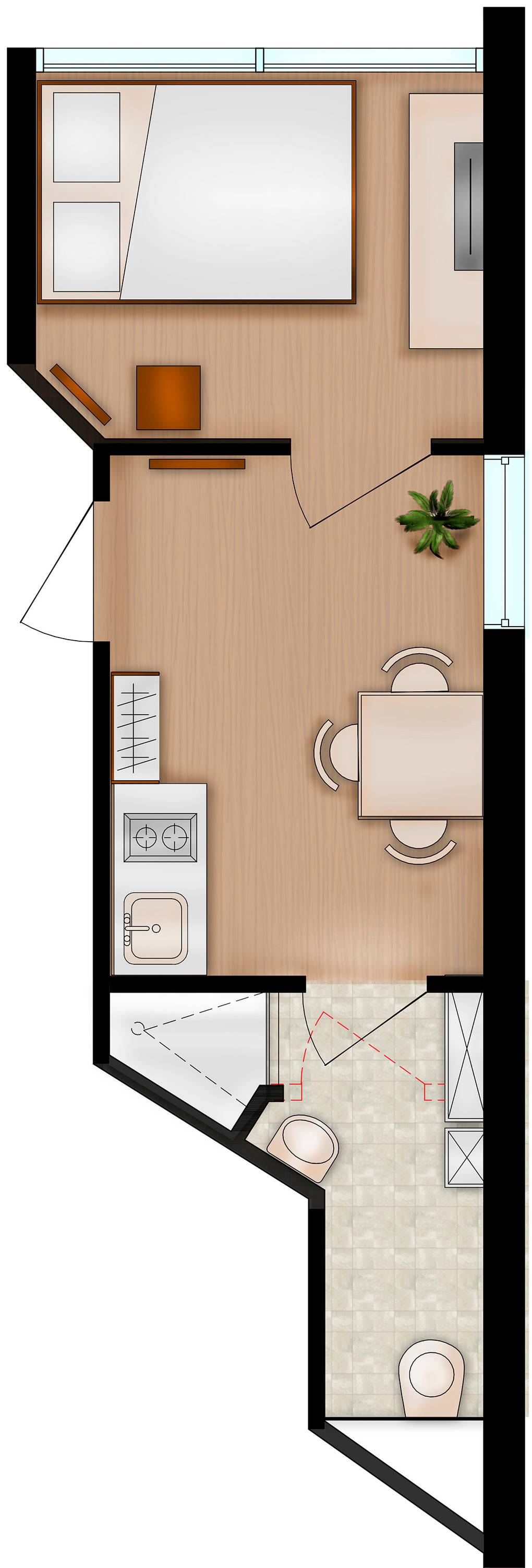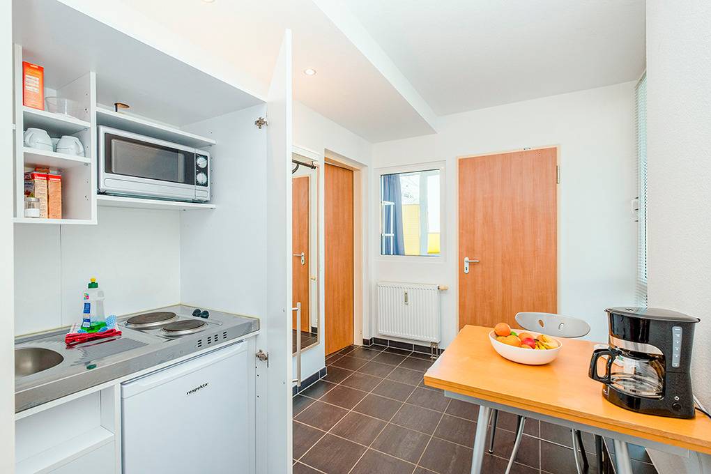 D 132.79 Wohnung 1-2 Pers.: 1 ½-Zimmerwohnung, 18 qm Wohnfläche, Parterre. Kleine Wohnküche mit Esstisch, Pantryküche (2 Platten-Herd, Mikrowelle). Doppelzimmer mit Schlafsofa (1-2 Pers.), TV. Bad/WC. Hinweise: aufgrund von Größe und Ausstattung der Wohnung empfehlen wir eine Belegung mit nur einer Person. Die Wohnung grenzt an den Eingangsbereich der Residenz an – dadurch kann es zu einer entsprechenden Geräuschentwicklung kommen.
