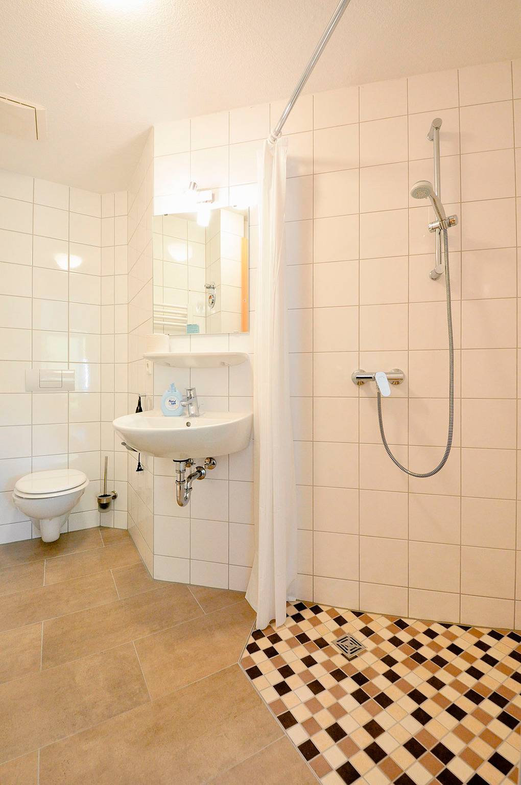 „Verbesserung: Ein Wasserschieber nach dem Duschen fehlt und bei Regentage ein Wischmop für den Eingangsbereich zum trocken machen.“