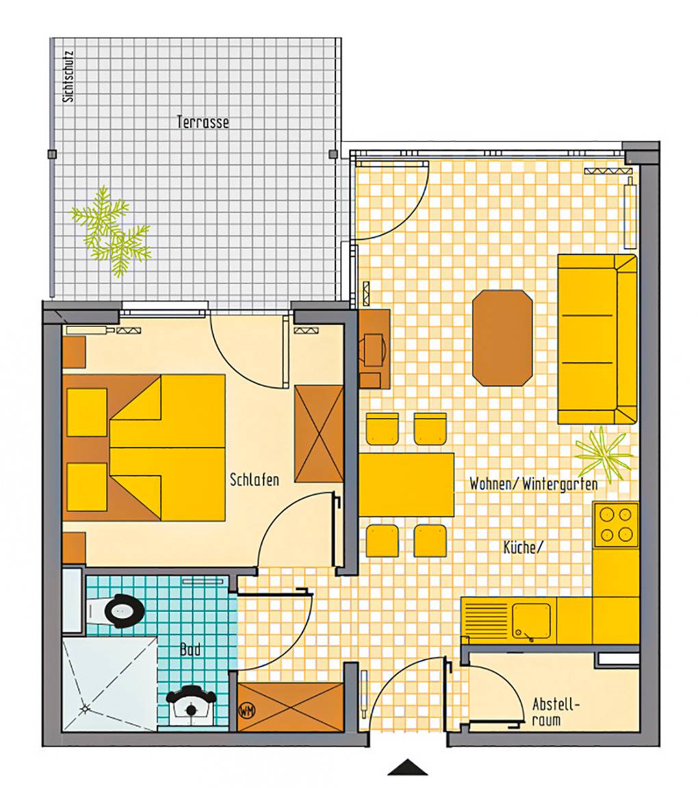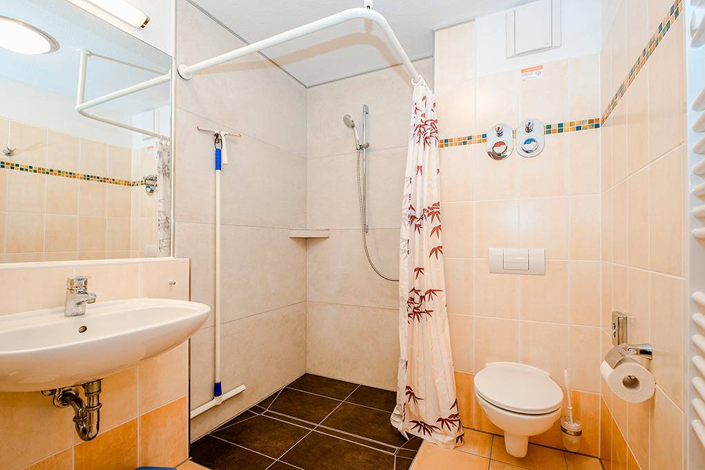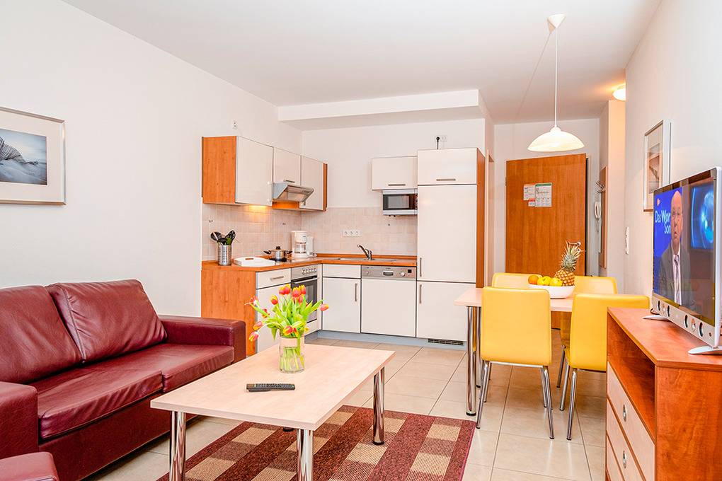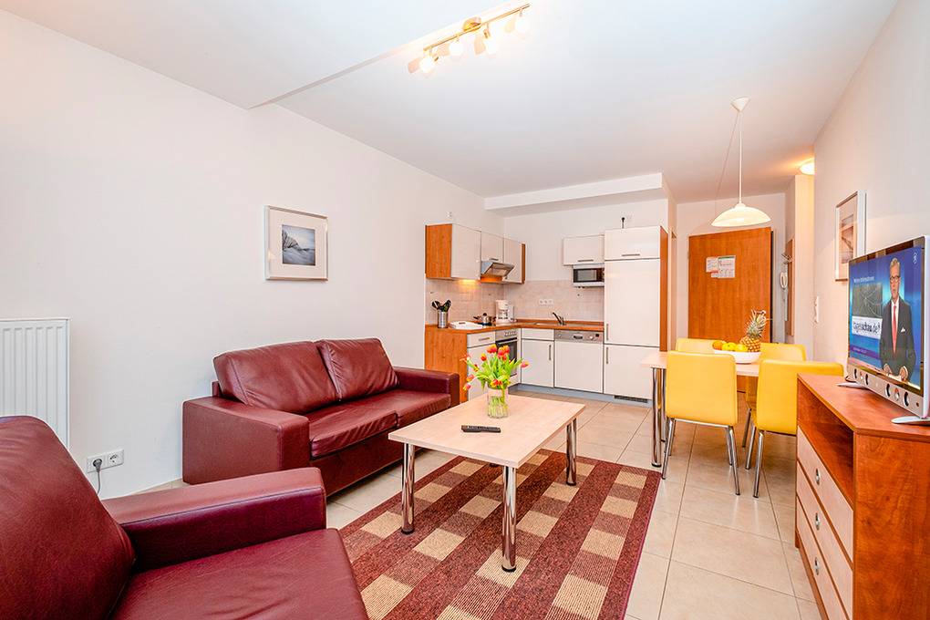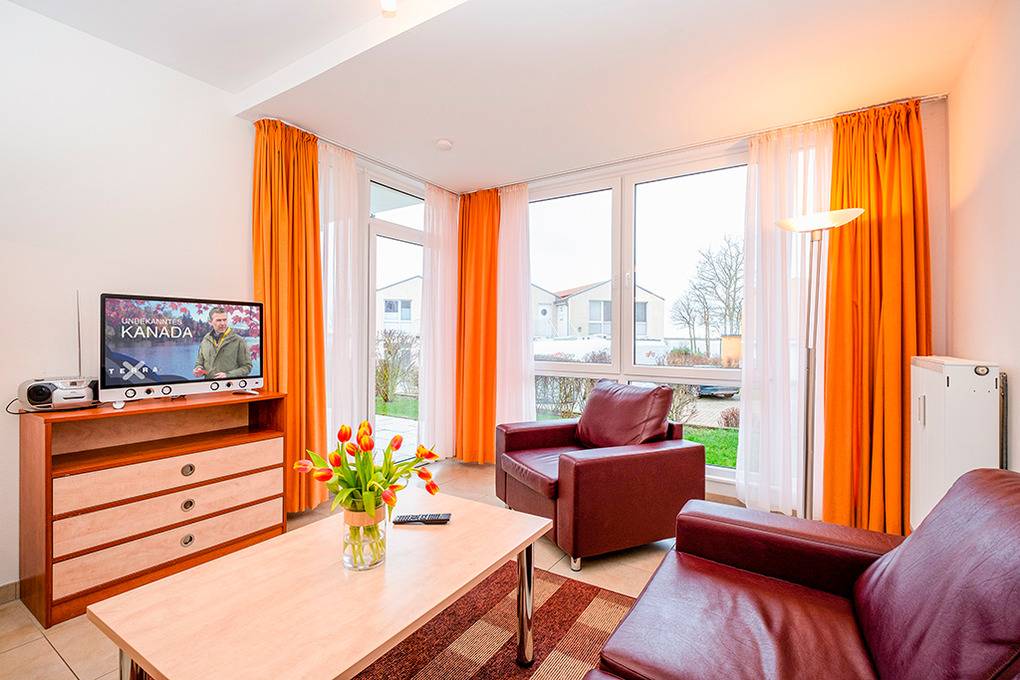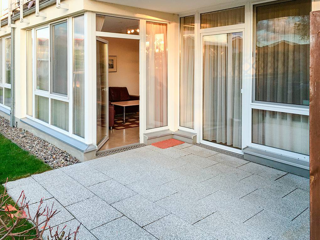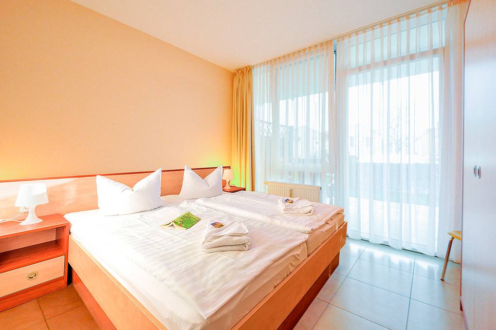 D 132.71 Wohnung 2-4 Pers.: 2-Zimmerwohnung, 50 qm Wohnfläche, Parterre. Wohn-/Essraum mit Couchgarnitur (Schlafcouch 2 Pers.), Esstisch, Küchenzeile. Doppelzimmer. Bad/WC. Überdachte Terrasse (Sitzmöbel, begrenzter Wasserblick). Hinweis: diese Wohnung ist mit verbreiterten Türen und großer, bodengleicher Dusche rollstuhlgeeignet.
