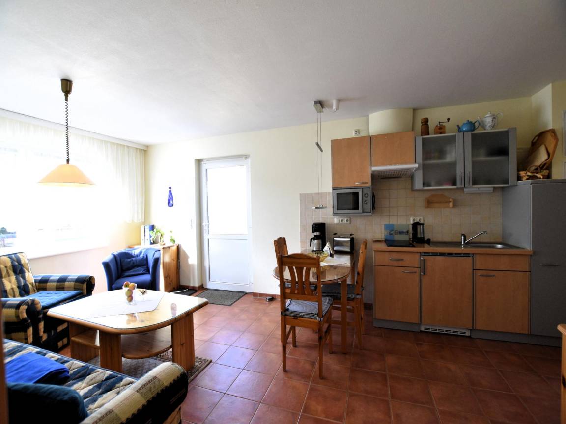 Layout : Parterre: offene Küche mit Wasserkocher, Toaster, Kochherd, Kaffeemaschine(Filter), Backofen, Mikrowelle, Kühl-/Gefrierkombination , Wohn/Esszimmer mit TV, Esstisch, Sitzecke, Radio, CD-Spieler , Schlafzimmer mit Doppelbett king size , Schlafzimmer mit Einzelbett, 1x Kinderbett (ohne Bettwäsche) , Badezimmer mit Dusche, Waschbecken, Toilette