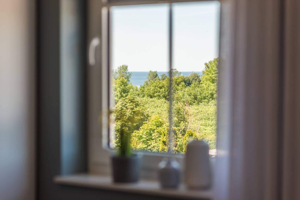 Über das große Fenster gelangen Sie auf dem BALKON mit 4 Stühlen und kleinem Tisch. Hier kann man einen Blick auf die Ostsee erhaschen. Am Abend lassen Sie hier Ihren Tag bei einem Glas Wein und einem guten Buch ausklingen.