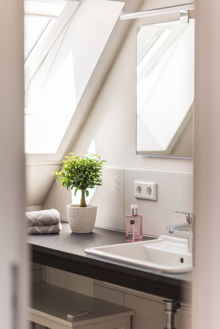 Beide BADEZIMMER verfügen über ebenerdige Dusche, WC, Waschtisch mit Spiegel, Handtuchwärmer und Haartrockner. Im Bad im 1. OG gibt es außerdem einen Waschtrockner zur kostenlosen Nutzung. Die Fußbodenheizung in der gesamten Wohnung sorgt für Wohlbefinden.