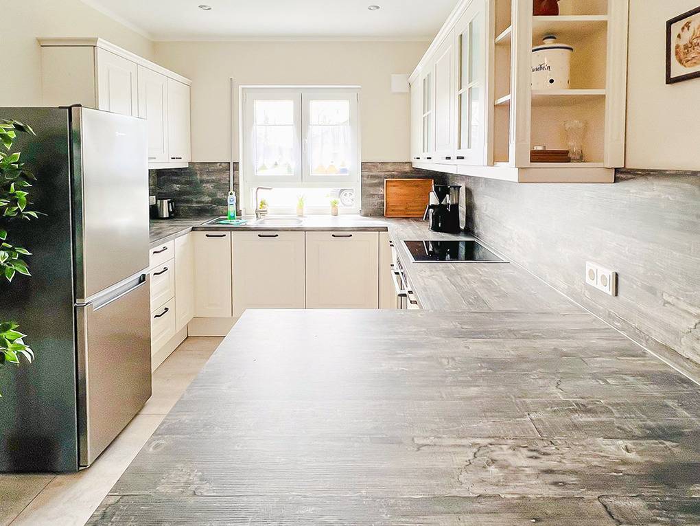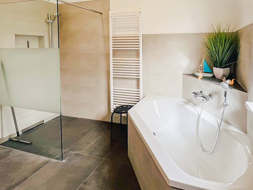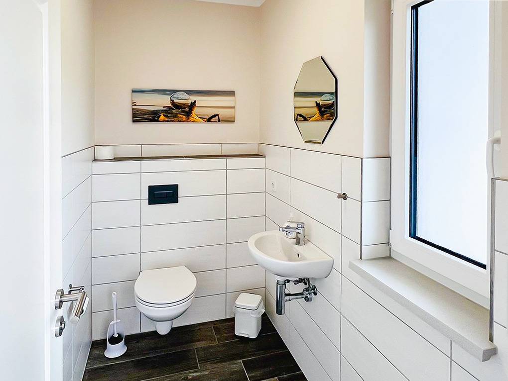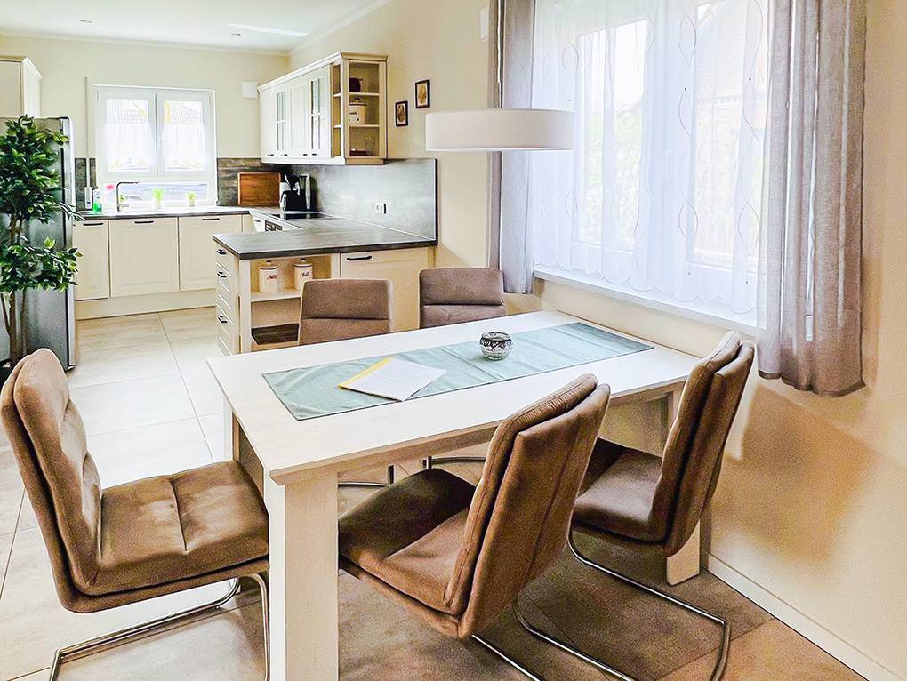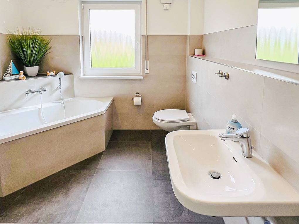 Haus: Moderne Doppelhaushälfte mit schönem 1000 qm großen Garten. Komfortable Einrichtung, geschmackvolle Möblierung. Fußbodenheizung. Kostenloser Internetzugang über W-Lan. Nichtraucherhaus. Teilüberdachte Terrasse mit Sitzmöbeln.Großer Garten mit Spiel- und Liegewiese. Gartenhaus für Fahrräder. Pkw-Stellplätze am Haus.