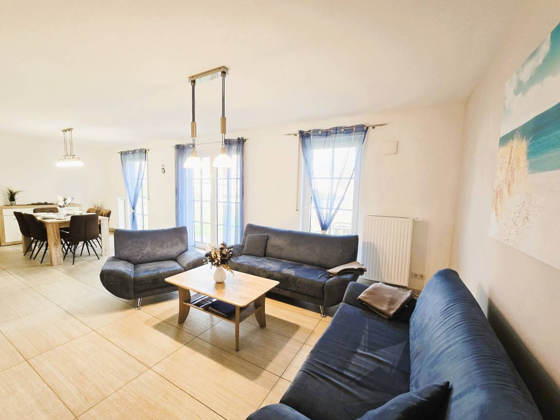 Es verfügt über ein großes und lichtdurchflutetes Wohnzimmer mit bequemen Sitzmöglichkeiten und einem Flat-TV, für entspannte Abende mit Ihren Liebsten. Außerdem befindet sich hier ein großer Esstisch, an welchem sich die, in der voll ausgestatteten Küche, frisch zubereiteten Mahlzeiten gemeinsam genießen lassen. In den drei Schlafzimmern des Ferienhauses, welche mit gemütlichen Betten ausgestattet sind, finden Sie nach einem erlebnisreichen Urlaubstag Ihren erholsamen Schlaf. Zwei Schlafzimmer verfügen über ein großes Kingsize-Doppelbett, während das dritte Schlafzimmer mit zwei Einzelbetten ausgestattet ist. Das umzäunte Ferienhaus ist sehr kinderfreundlich eingerichtet. 2 x Reisebett, 2 x Hochstuhl, Kindergeschirr und Kinderbesteck, Spielzeug, Treppengitter, Bollerwagen / Buggy, sowie ein Spielplatz mit Schaukel, Strickleiter und Rutsche stehen Ihnen zur Verfügung. Wer es aktiv mag, wird im Schuppen fündig, hier stehen 2 Fahrräder zur Verfügung (Nutzung auf eigene Gefahr, keine Garantie für Verkehrstauglichkeit)