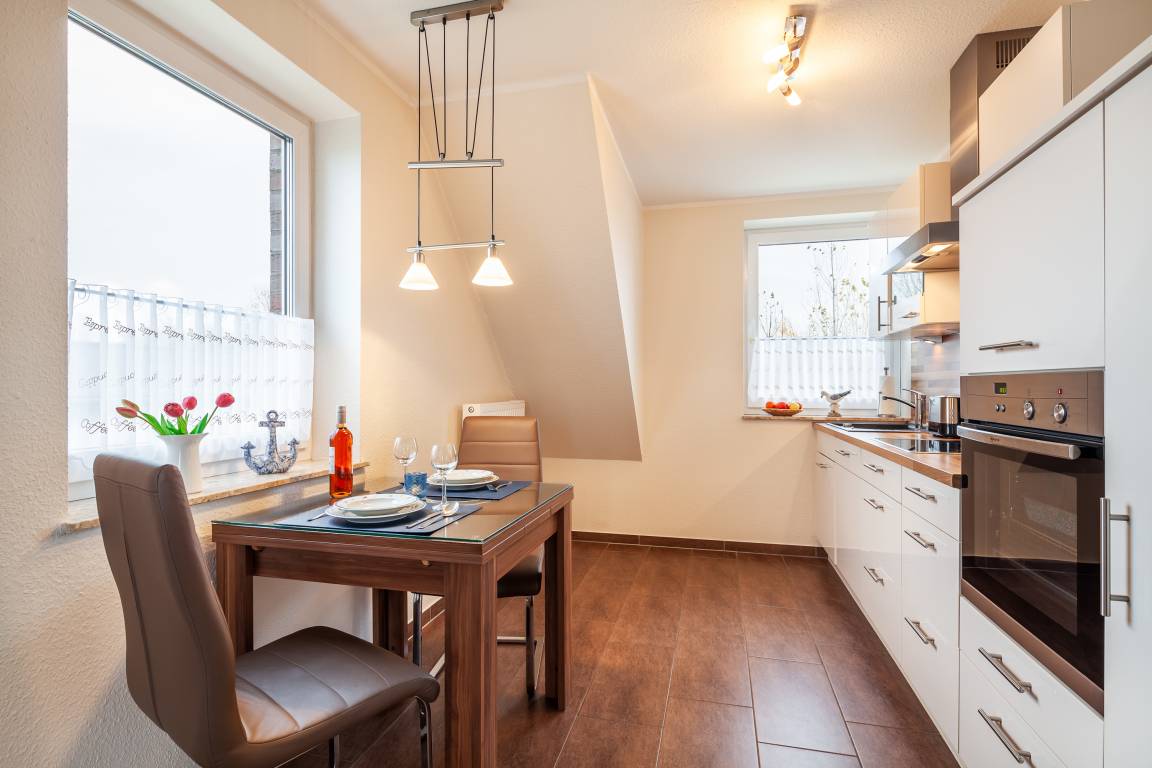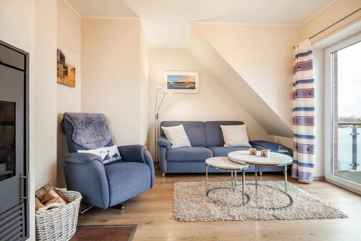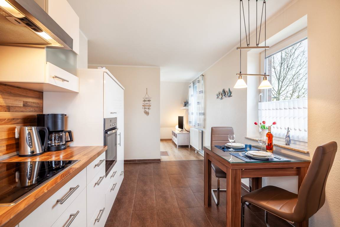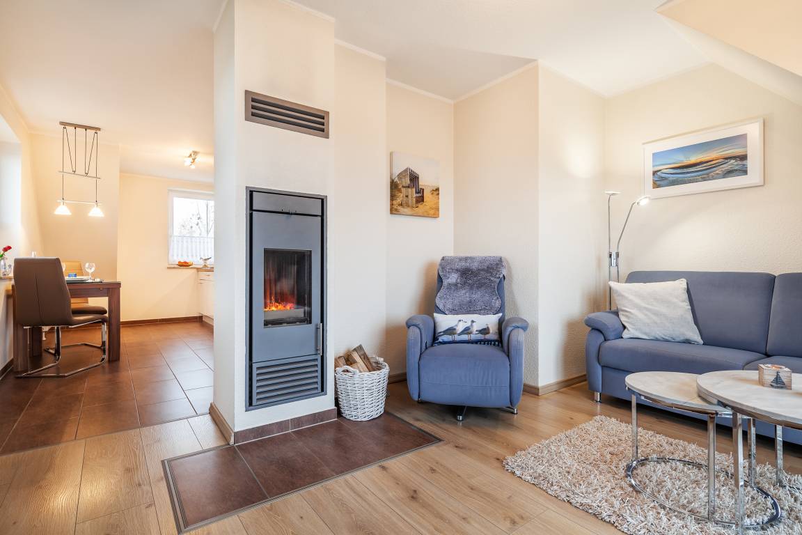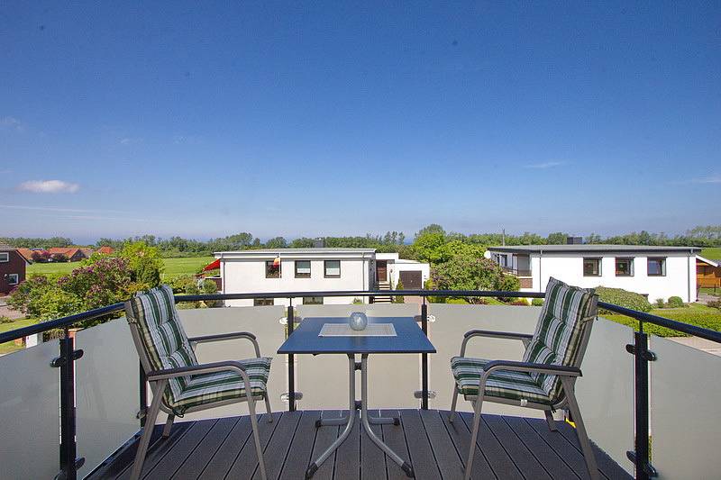Die Fewo 'Albatros' , 52qm, mit einem Balkon liegt im Obergeschoss und bietet einen tollen Blick auf die Ostsee. Sie verfügt über ein in weiß gehaltenes Schlafzimmer mit einem Doppelbett mit einer Liegefläche von 180 x 200 cm, Die offene Küche ist mit allem Komfort wie Geschirrspüler, Kühlschrank mit Gefrierfach, Mikrowelle, Ceranfeld, erhöhter Backofen, Granitspüle, Kaffeemaschine usw. ausgestattet. Der Esstisch am Fenster bietet mit den bequemen Schwingstühlen Platz für 2 Personen. Der gemütliche Wohnraum mit Kamin ist in einem behaglichen maritimen Stil mit einem komfortablen Sofa eingerichtet. Ein großer LCD-Fernseher, Blu-Ray-Player, sowie Spiele, Bücher und Umgebungskarten sind vorhanden. Das schöne Badezimmer mit Tageslichtfenster ist in creme/braun gehalten, mit einem großen Waschtisch, Dusche 0,90 x 1,00 m, Fußbodenheizung und Radio ausgestattet. Der geräumige Flur und ein separater Abstellraum bieten viel Platz.