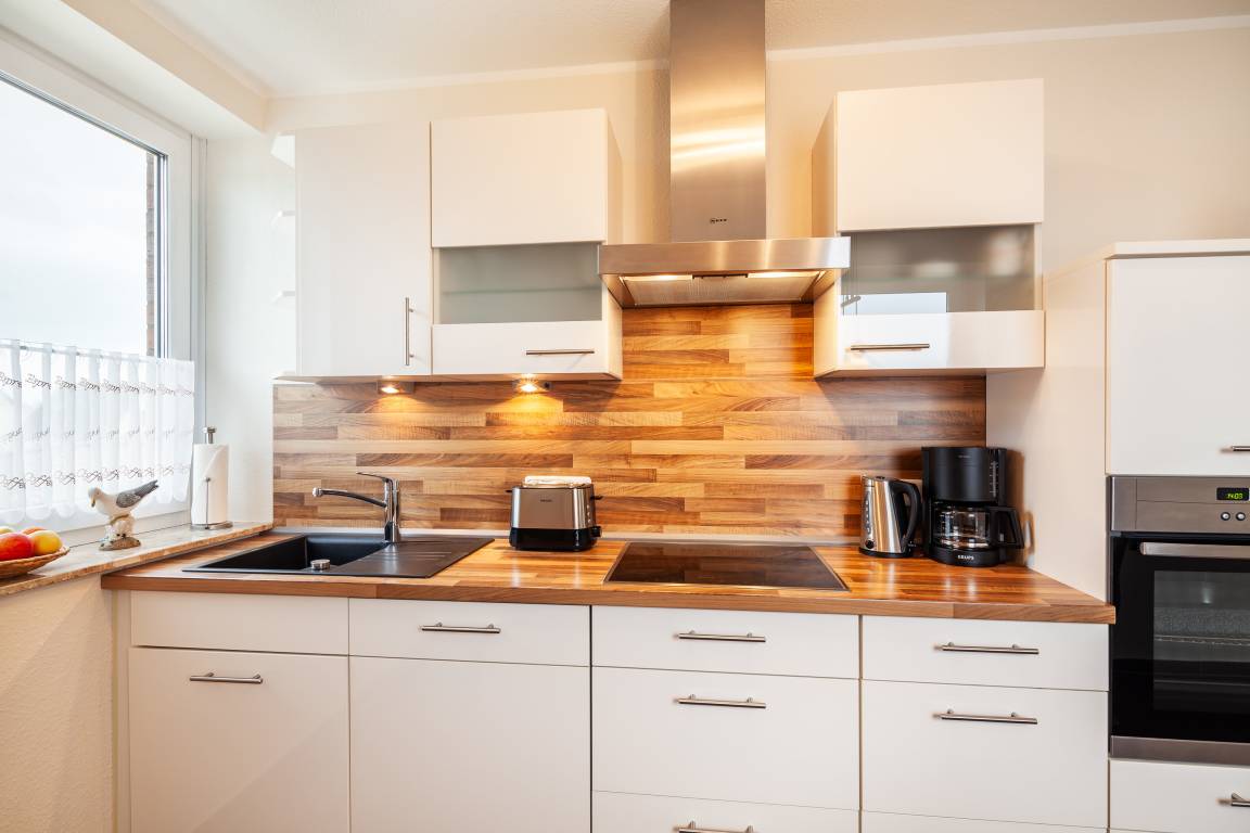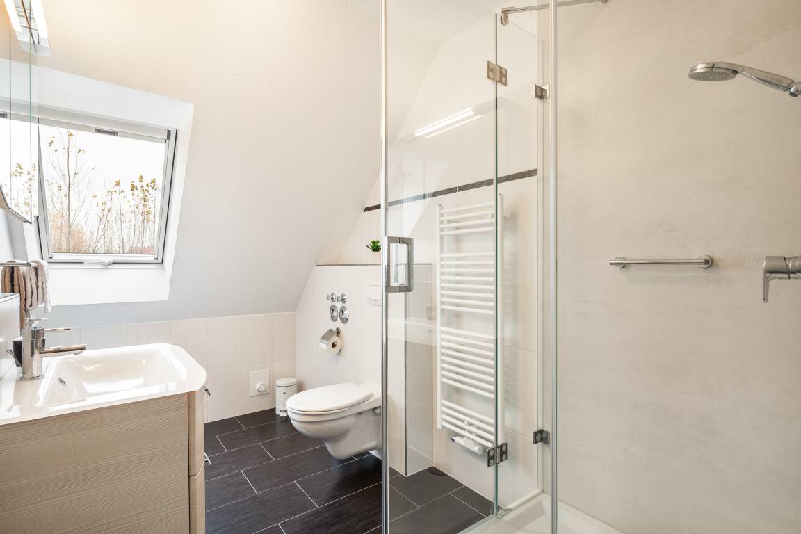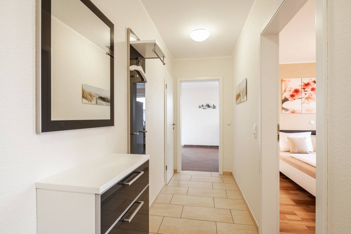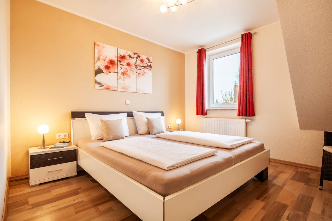Die Fewo 'Albatros' , 52qm, mit einem Balkon liegt im Obergeschoss und bietet einen tollen Blick auf die Ostsee. Sie verfügt über ein in weiß gehaltenes Schlafzimmer mit einem Doppelbett mit einer Liegefläche von 180 x 200 cm, Die offene Küche ist mit allem Komfort wie Geschirrspüler, Kühlschrank mit Gefrierfach, Mikrowelle, Ceranfeld, erhöhter Backofen, Granitspüle, Kaffeemaschine usw. ausgestattet. Der Esstisch am Fenster bietet mit den bequemen Schwingstühlen Platz für 2 Personen. Der gemütliche Wohnraum mit Kamin ist in einem behaglichen maritimen Stil mit einem komfortablen Sofa eingerichtet. Ein großer LCD-Fernseher, Blu-Ray-Player, sowie Spiele, Bücher und Umgebungskarten sind vorhanden. Das schöne Badezimmer mit Tageslichtfenster ist in creme/braun gehalten, mit einem großen Waschtisch, Dusche 0,90 x 1,00 m, Fußbodenheizung und Radio ausgestattet. Der geräumige Flur und ein separater Abstellraum bieten viel Platz.