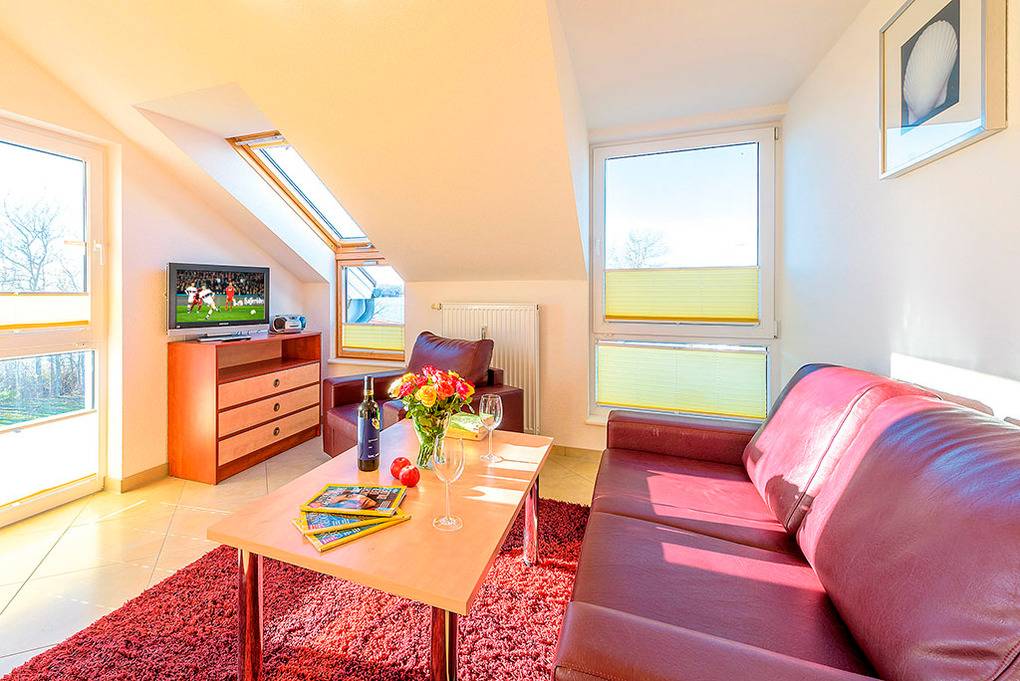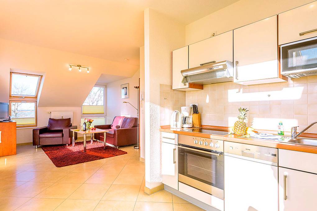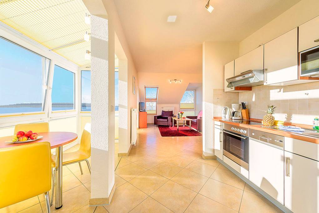 D 132.70 Wohnung 2-4 Pers.: 2-Zimmerwohnung, 38 qm Wohnfläche, 2. Etage, Wasserblick. Wohn-/Essraum mit Couchgarnitur (Schlafsofa 1-2 Pers.), Esstisch in schönem Erker (Wasserblick), moderner Einbauküche. Doppelzimmer. Bad/WC.