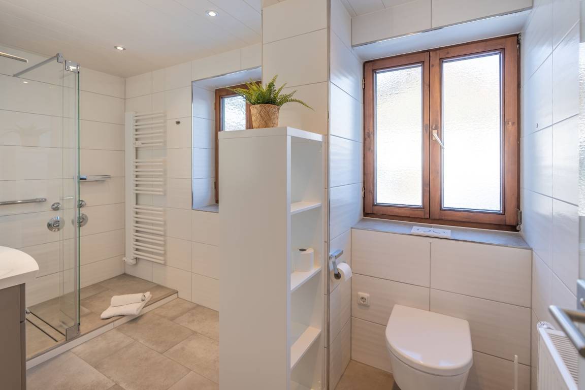 Das helle und gemütliche Wohnzimmer verfügt über einen Kachelofen, der für eine behagliche Atmosphäre an kühleren Abenden sorgt. Die moderne Küche ist bestens ausgestattet und lädt zum kochen Ihrer Lieblingsgerichte ein. Das großzügige und moderne Badezimmer begeistert mit einer begehbaren Dusche, die für besonderen Komfort sorgt. In Schlafzimmer 1 erwartet Sie ein gemütliches Doppelbett sowie ein praktisches Stockbett, ideal für Familien oder Gruppen. Das Schlafzimmer 2 ist mit zwei Einzelbetten und einem Kleiderschrank ausgestattet. Im Flur finden Sie weitere Schränke, um all Ihre Habseligkeiten ordentlich zu verstauen.