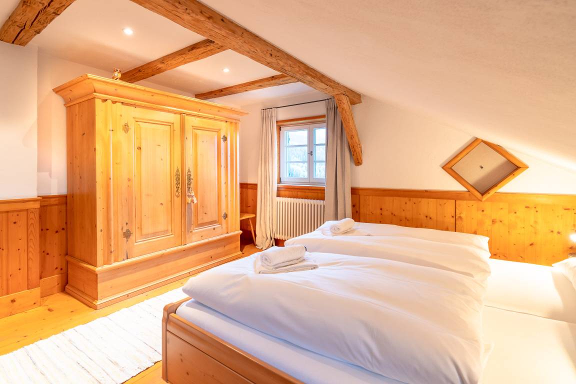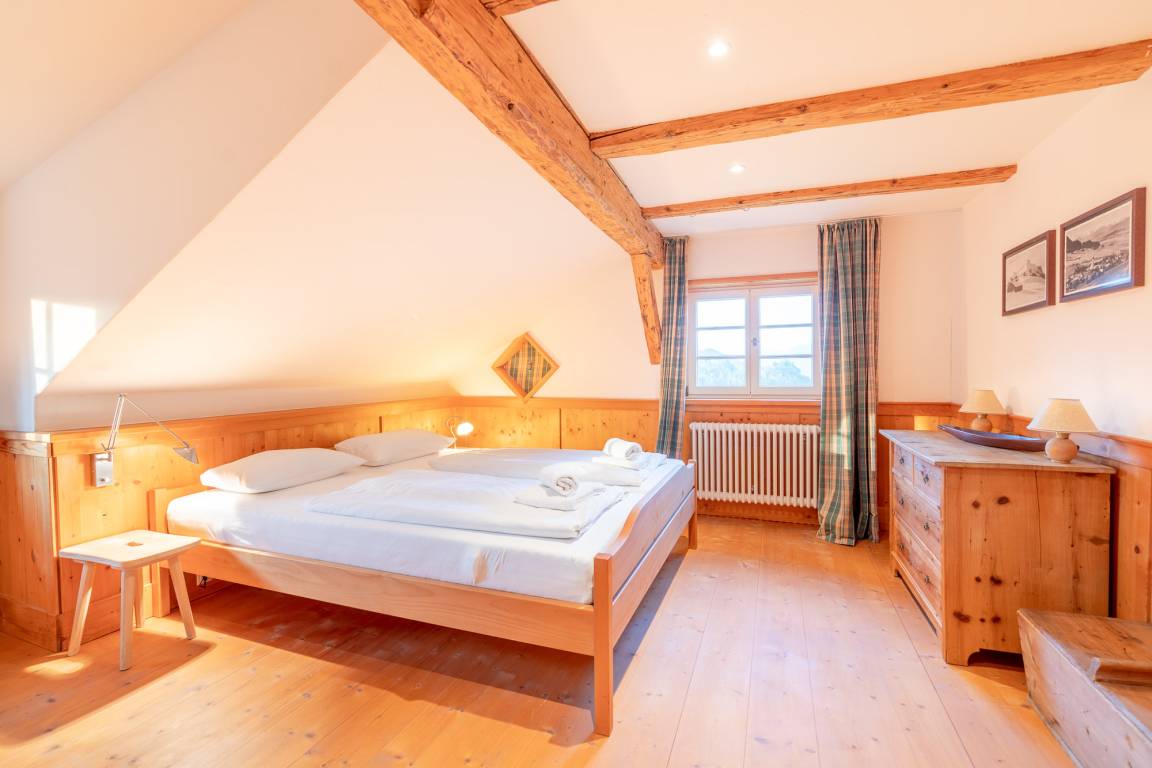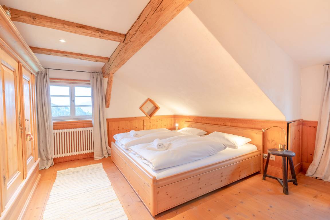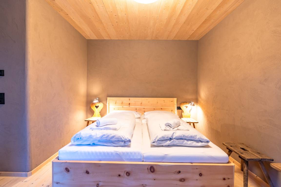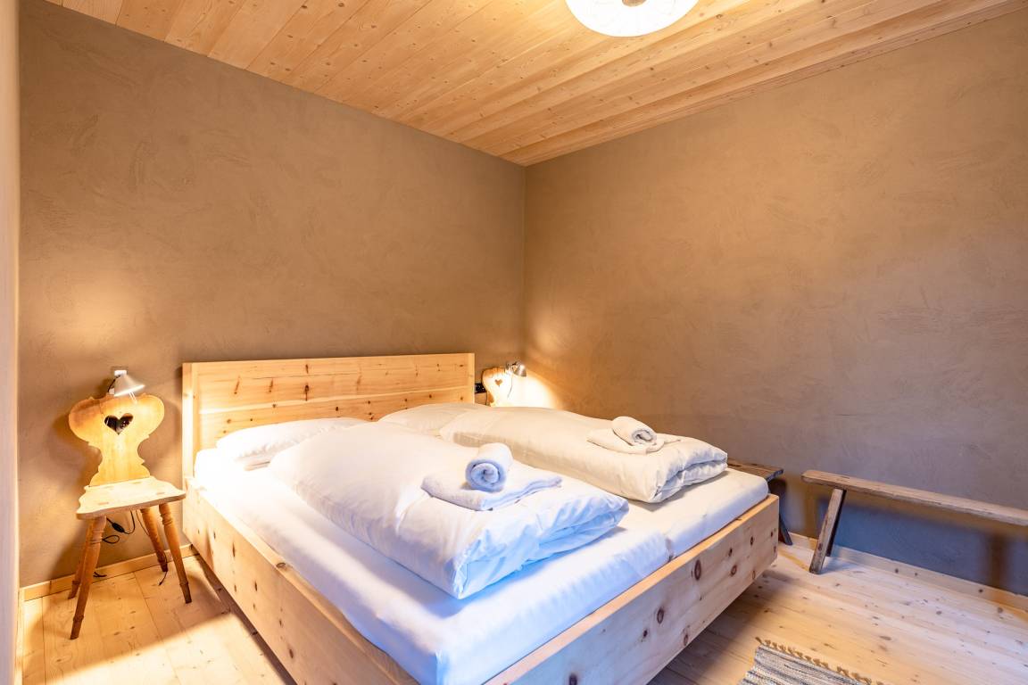 Das 1. Schlafzimmer befindet sich im Untergeschoss. Durch seinen Lehmputz verfügt dieser Raum über ein angenehmes Raumklima und sorgt für einen gesunden Schlaf. Das gemütliche Doppelbett aus Zirbenholz versprüht einen angenehmen Duft nach frischem Holz. Im dazugehörigen Badezimmer stehen Ihnen eine Dusche, WC und ein Doppel-Waschtisch zur Verfügung.