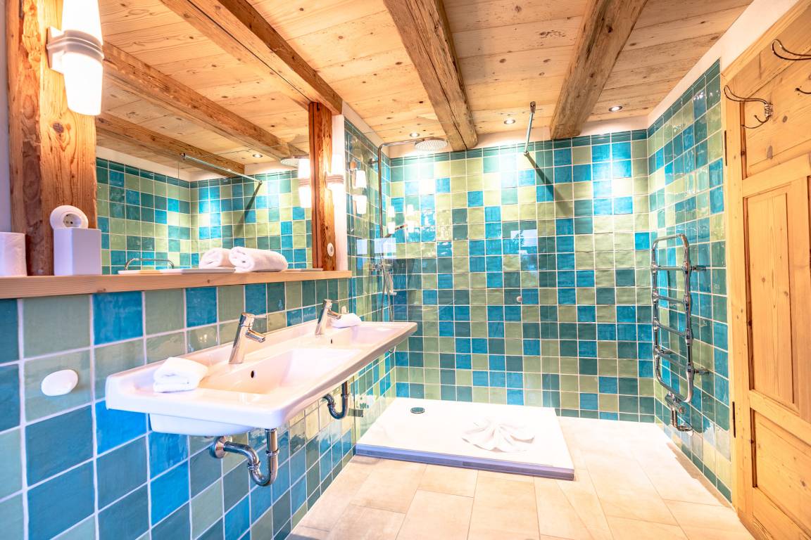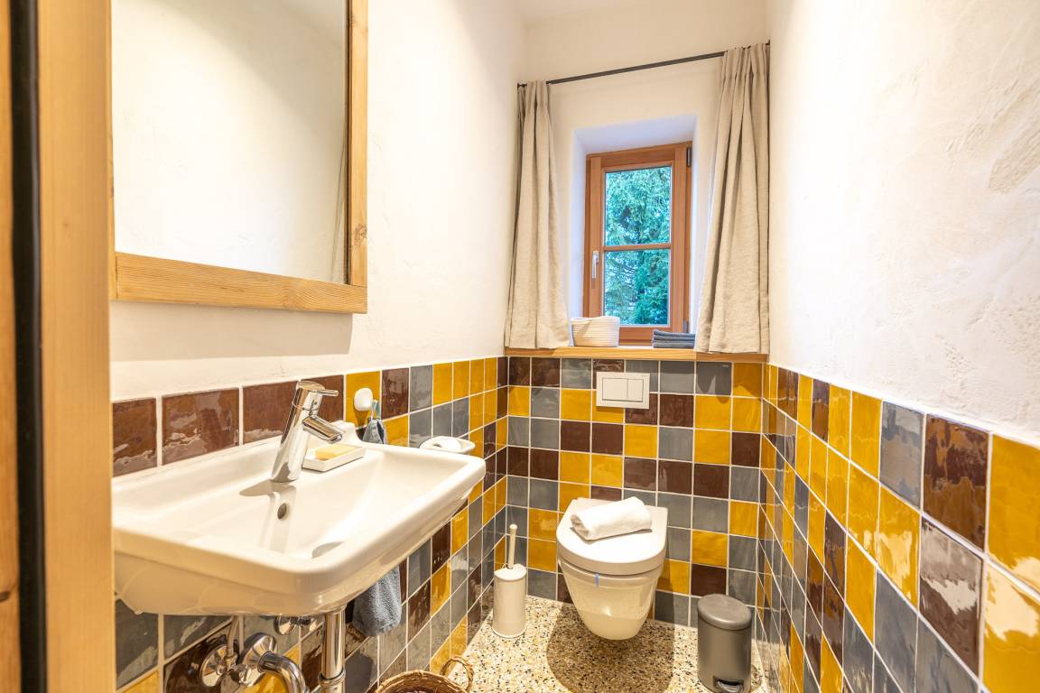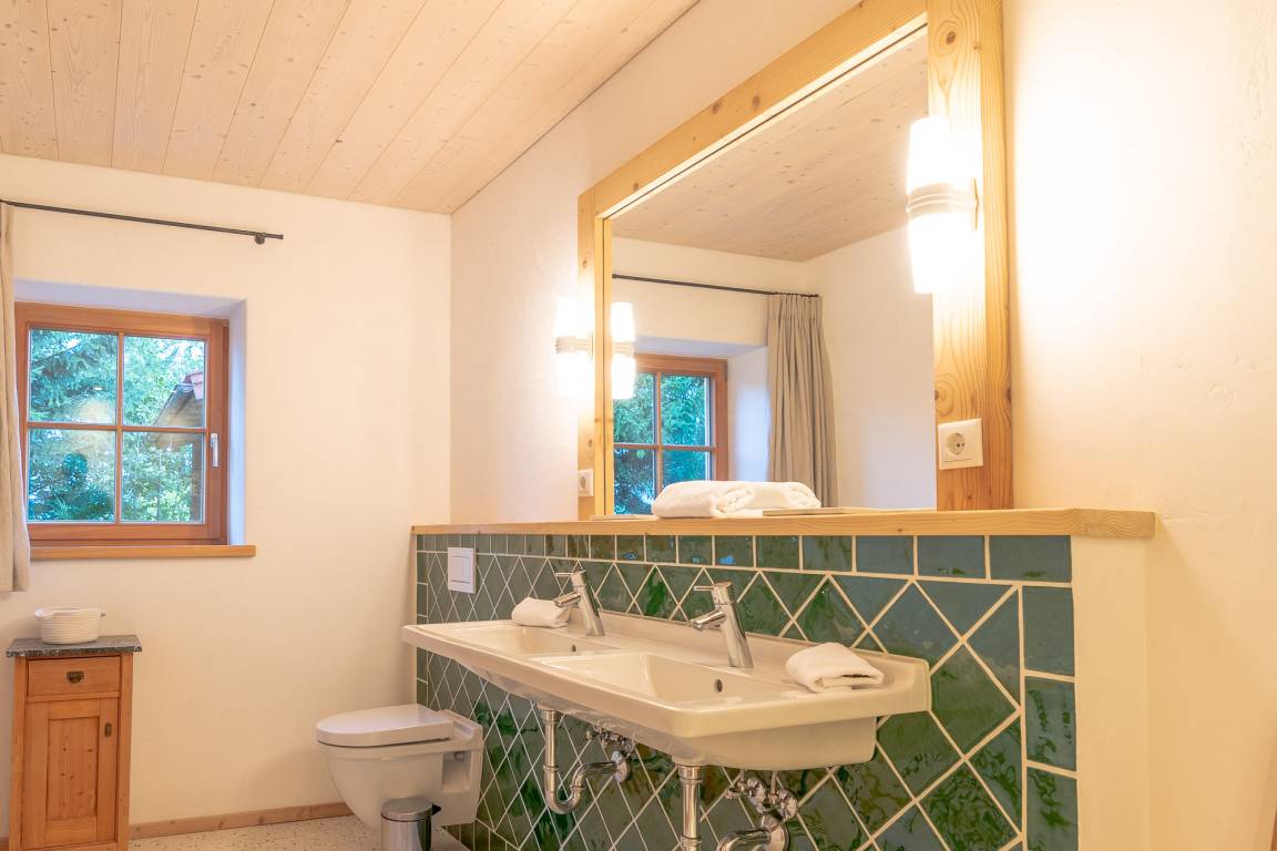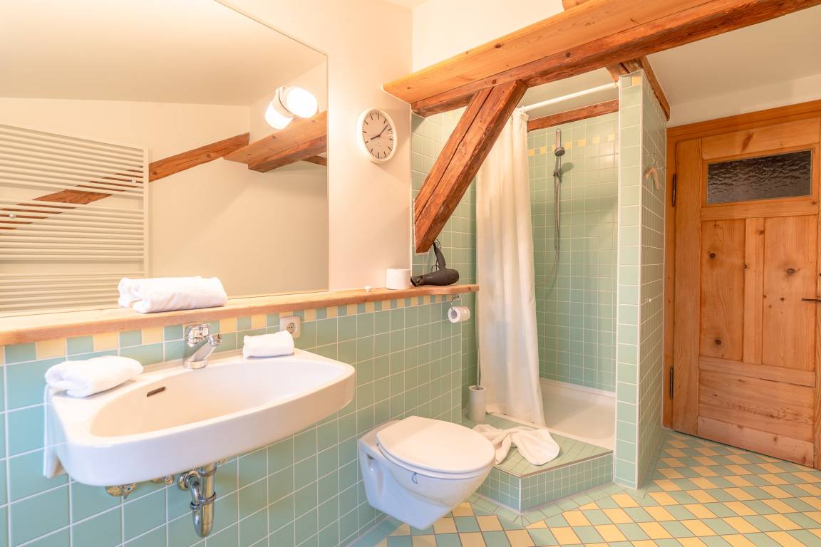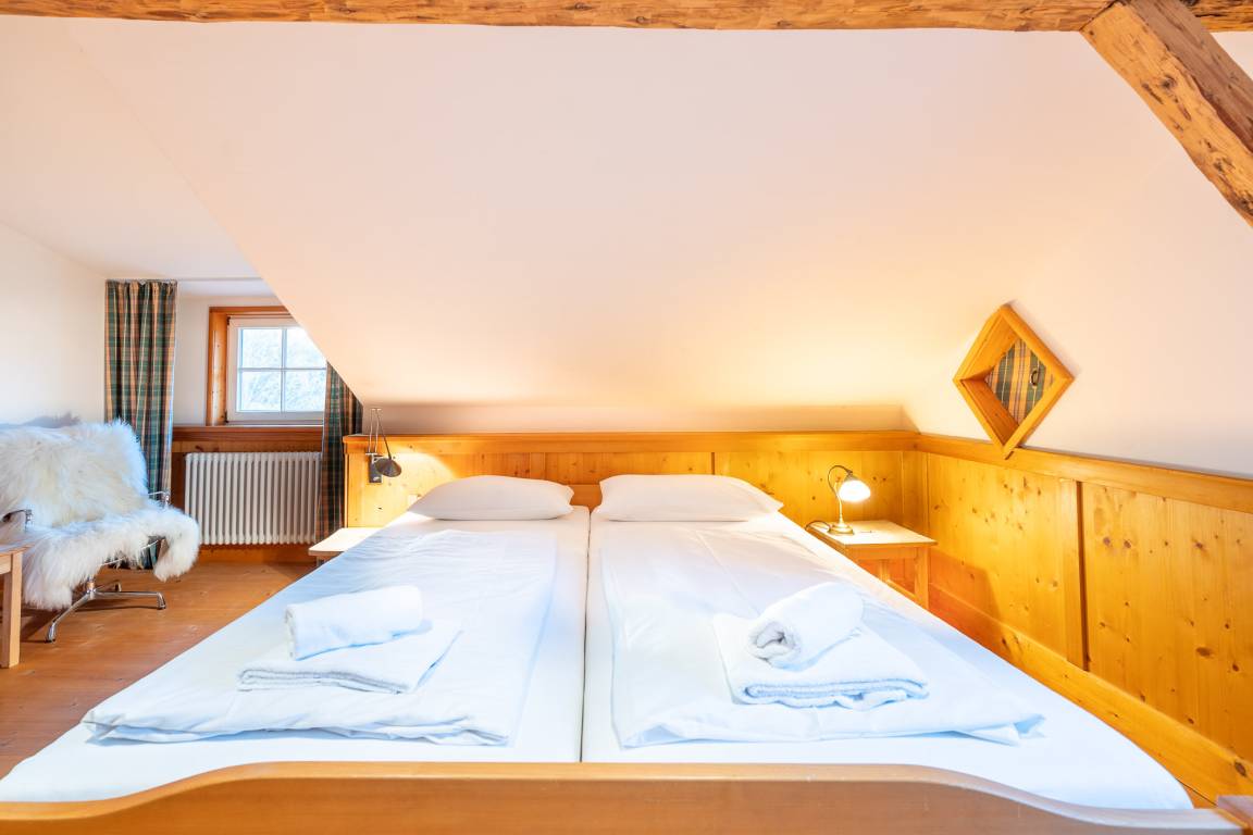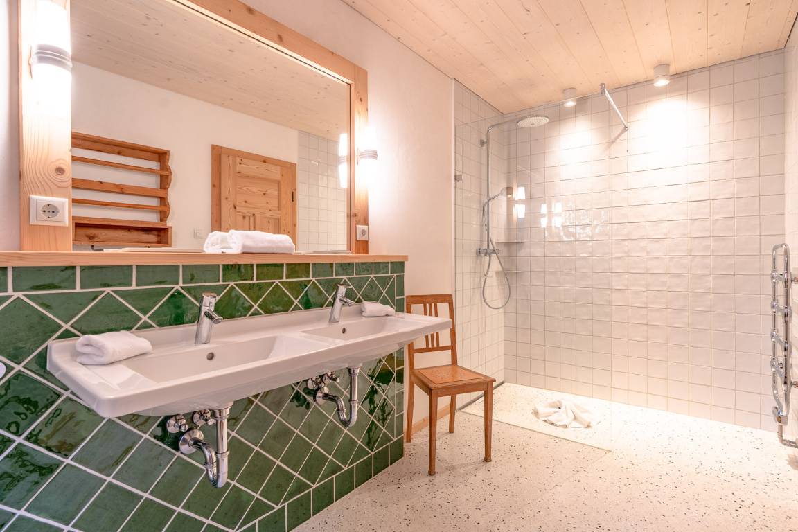 Das 1. Schlafzimmer befindet sich im Untergeschoss. Durch seinen Lehmputz verfügt dieser Raum über ein angenehmes Raumklima und sorgt für einen gesunden Schlaf. Das gemütliche Doppelbett aus Zirbenholz versprüht einen angenehmen Duft nach frischem Holz. Im dazugehörigen Badezimmer stehen Ihnen eine Dusche, WC und ein Doppel-Waschtisch zur Verfügung.