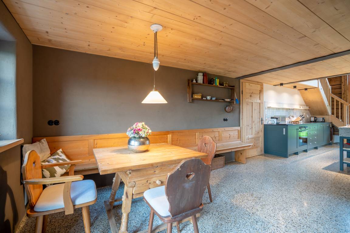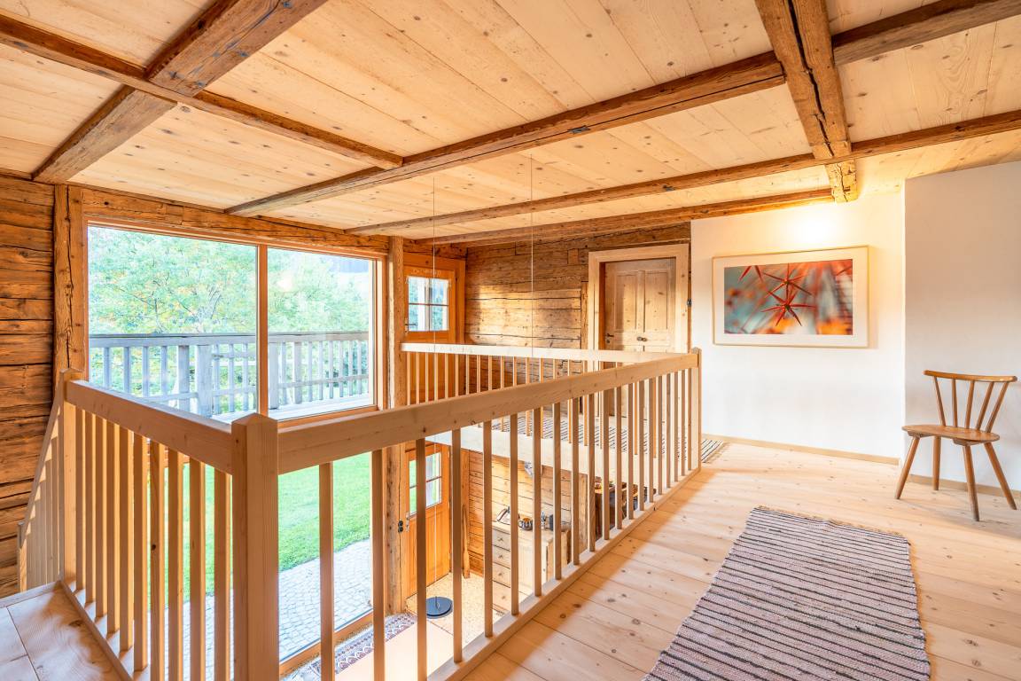 Sie betreten dieses weitläufige Ferienhaus über einen großzügigen Eingangsbereich von der Tenne aus. Von dort aus können Sie auch direkt mit dem Aufzug in das Haus gelangen. Vom Flur aus erreichen Sie den zentralen Mittelpunkt Ihres Ferienheimes, die geräumige, modern ausgestattete Küche im Landhausstil, diese lässt keine kulinarischen Wünsche offen und läd zum gemeinsamen kochen und zu geselligen Stunden mit Familie und Freunden ein. Die liebevoll renovierte Holzstube strahlt Behaglichkeit und Wohlbefinden aus, ebenso wie das Panoramazimmer, lassen Sie die Seele baumeln. Sie werden sich in jedem dieser Räume wohlfühlen und es wird bestimmt jeder von Ihnen seinen ganz persönlichen Lieblingsplatz zum Entspannen und Abschalten finden. Genießen Sie Erholung pur, bei dem 360 Grad Blick in die Weite, in der Außensauna mit Fenstern oder abends bei einem Sundowner am Außenkamin oder auf der Westterrasse.
