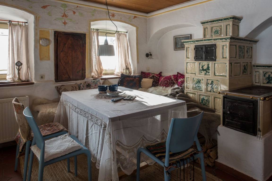 Küche mit komplettem Inventar ausgestattet plus Ofenbank am Kachelofen hell und gemütlich