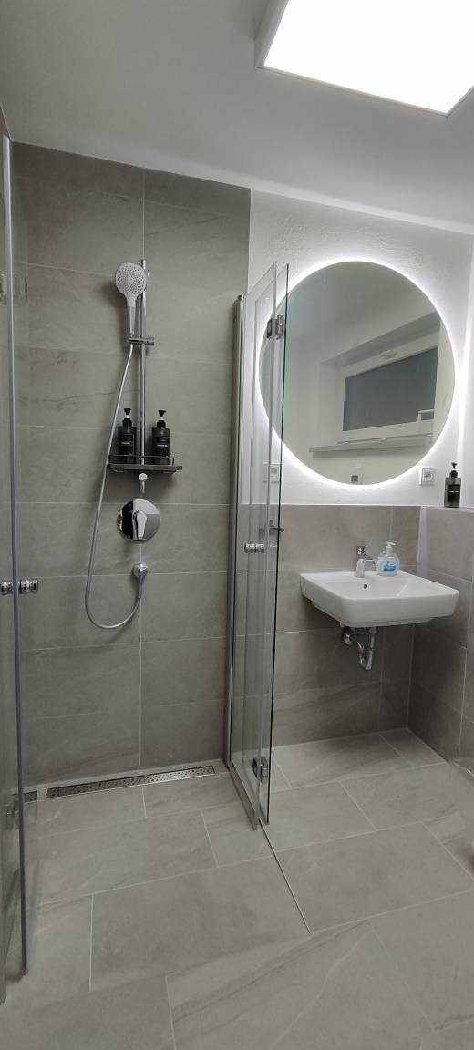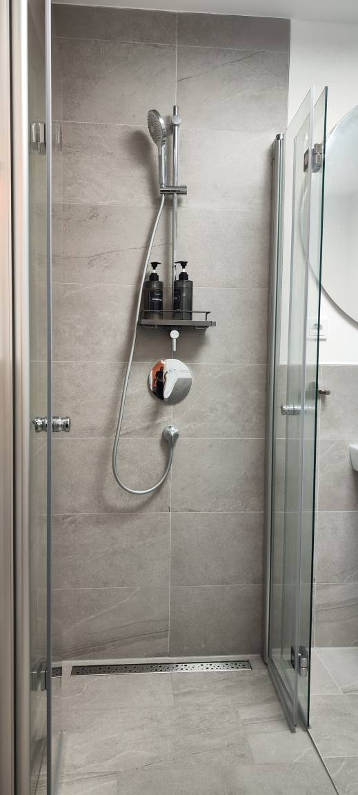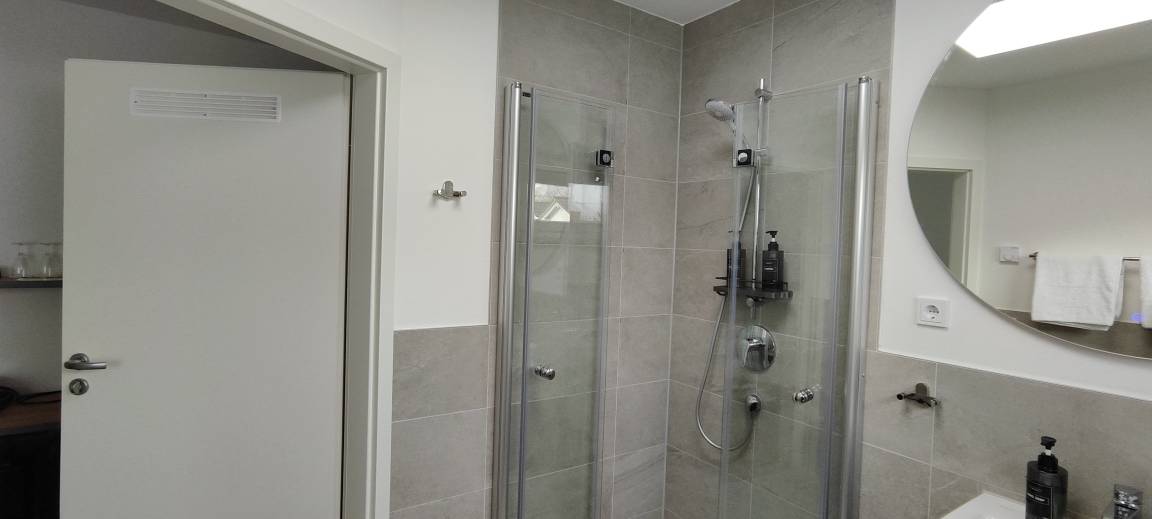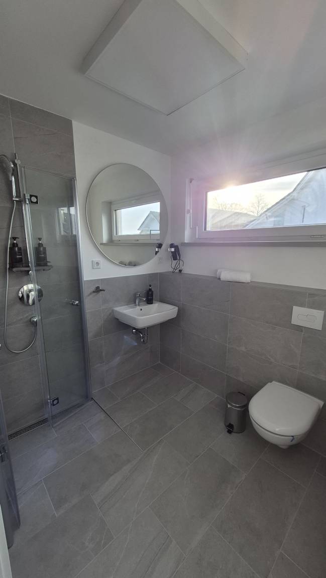 Das moderne Badezimmer bietet eine funktionale Ausstattung mit einer Dusche, einem Waschbecken, einer Toilette und einem Fenster, das auch hier für angenehmes Tageslicht sorgt. Hochwertige sanitäre Anlagen, frische Handtücher und ein Haartrockner stehen bereit, sodass die Gäste bestens versorgt sind. Das Fenster im Badezimmer sorgt zusätzlich für eine angenehme Belüftung und Helligkeit.