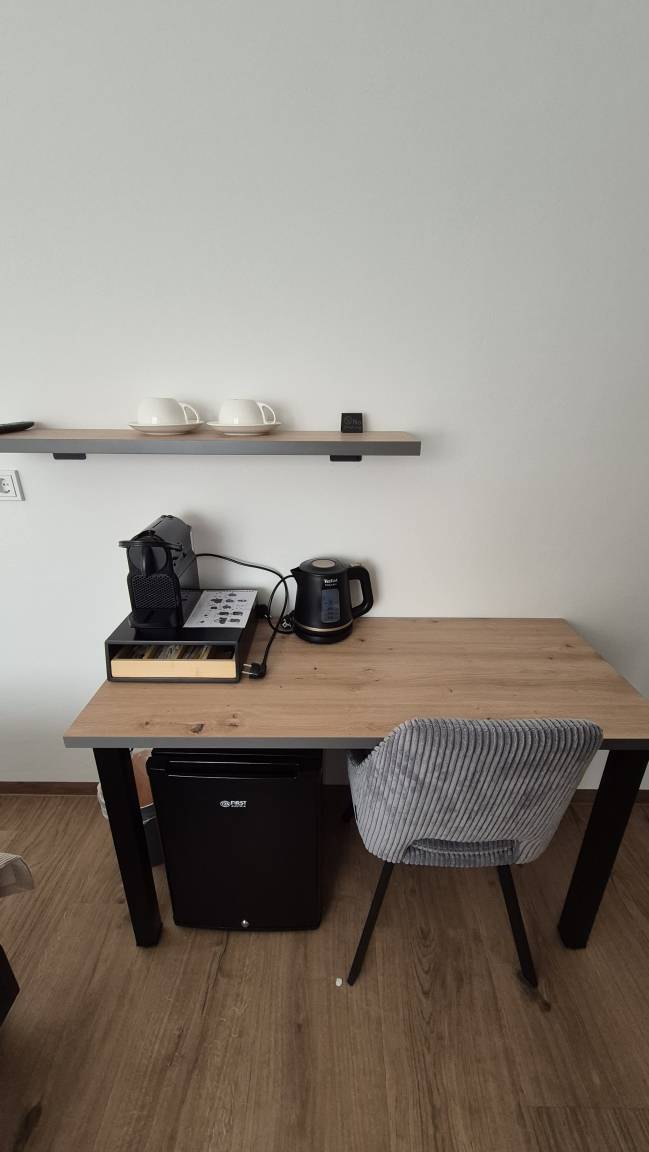 Darüber hinaus verfügt das Zimmer über einen kleinen Kühlschrank, einen Tisch sowie eine Kaffeemaschine und einen Wasserkocher, damit sich die Gäste jederzeit selbst Kaffee oder Tee zubereiten können. Ein Safe ist ebenfalls vorhanden, um Wertgegenstände sicher zu verwahren. Für Unterhaltung und optimale Vernetzung stehen WLAN, ein CAT-Internetanschluss und Kabel-TV zur Verfügung.
