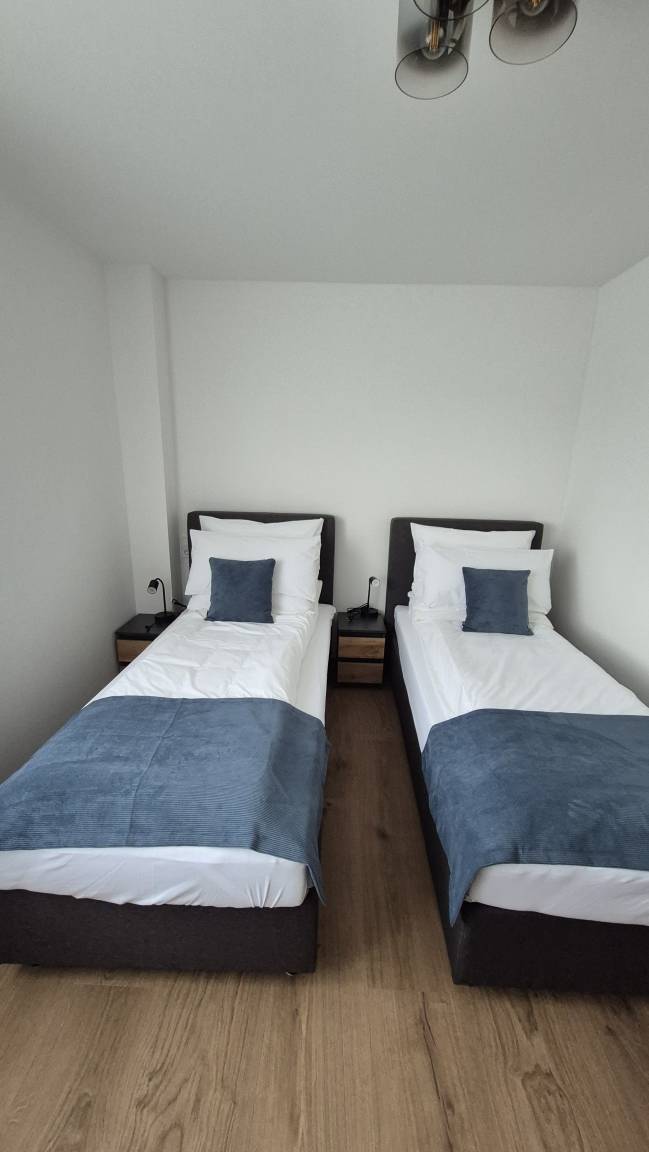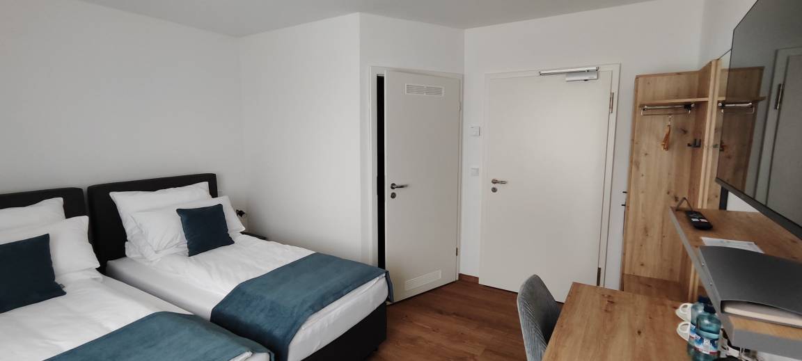 Der Raum ist geschmackvoll gestaltet und mit einem Doppelbett ausgestattet, das bei Bedarf in zwei Einzelbetten getrennt werden kann. Große Fenster lassen viel Tageslicht herein, wodurch eine helle, freundliche Atmosphäre entsteht. Für Privatsphäre und Sonnenschutz sind die Fenster zudem mit Rollläden ausgestattet. Das gesamte Zimmer, einschließlich des Badezimmers, ist mit einer Fußbodenheizung ausgestattet, die überall für zusätzlichen Komfort sorgt.