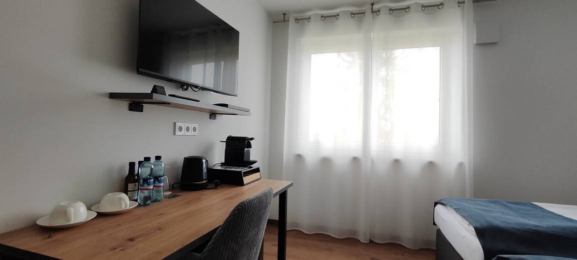 Darüber hinaus verfügt das Zimmer über einen kleinen Kühlschrank, einen Tisch sowie eine Kaffeemaschine und einen Wasserkocher, damit sich die Gäste jederzeit selbst Kaffee oder Tee zubereiten können. Ein Safe ist ebenfalls vorhanden, um Wertgegenstände sicher zu verwahren. Für Unterhaltung und optimale Vernetzung stehen WLAN, ein CAT-Internetanschluss und Kabel-TV zur Verfügung. Wenn Sie ein Babybett benötigen, können wir Ihnen dieses gerne zur Verfügung stellen, um Ihren Aufenthalt noch komfortabler zu gestalten.
