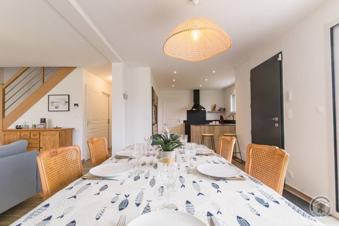 Freistehendes Haus. Wohnzimmer (TV, Glasfaser-Internet). Offene Küche (Induktionskochfeld, Backofen, Geschirrspüler, Kühl-/Gefrierschrank, Mikrowelle, Espressomaschine). Waschküche (Waschmaschine). Schlafzimmer 1 (Queensize-Bett) mit eigenem Duschbad. Separates WC. Obergeschoss: Schlafzimmer 2 (Queensize-Bett) mit Schreibtisch (RJ45-Steckdose). Schlafzimmer 3 (zwei Etagenbetten), Schlafzimmer 4 (Doppelbett), separates WC und Badezimmer. Babyausstattung auf Anfrage. Fußbodenheizung (Erdgeschoss) und Heizkörper (Obergeschoss). Alle Nebenkosten inklusive. Bettwäsche wird gestellt und die Betten sind bei Ankunft bezogen. Handtücher können gemietet werden. Reinigungsservice gegen Aufpreis. Privater, umzäunter Garten. Terrasse. Gartenmöbel. Grill. Sonnenliegen. Garage am Haus mit Spüle und Fahrrädern (2 Erwachsene, 1 Kind). Parkplatz. Nur Hunde erlaubt.