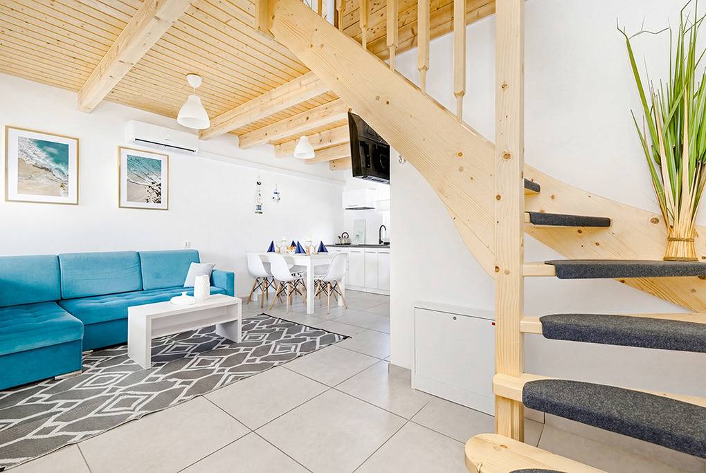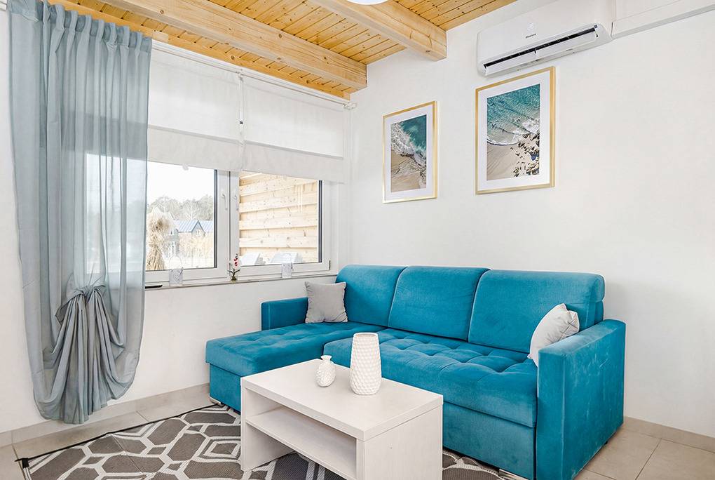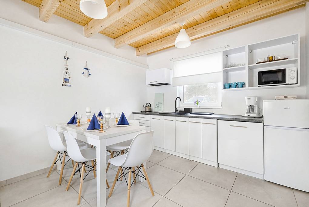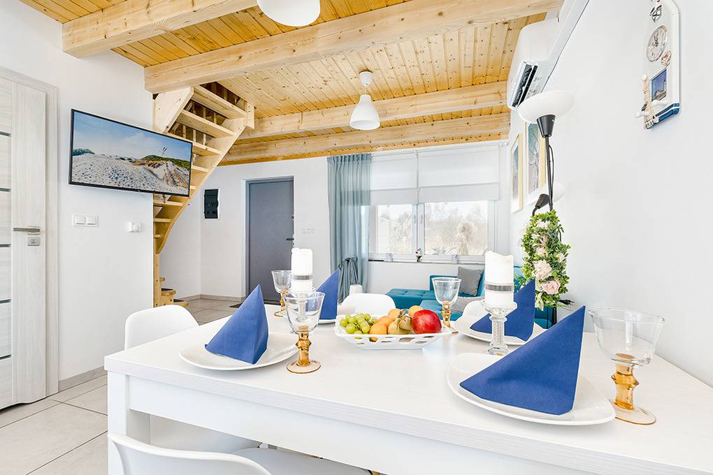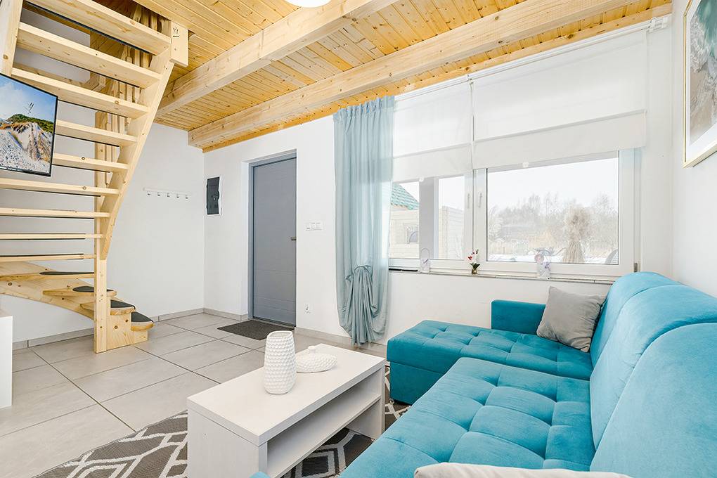 PL 34.25 Ferienhaus 1-6 Pers.: Gemütliches 3-Zimmer-Reihenhaus mit 70 qm Wohnfläche über 2 Etagen. Parterre: Schöner Wohn-/Essraum mit Sofa, Sat-TV (deutsche Programme), Esstisch, Küchenzeile (Induktionsfeld 2 Platten, Mikrowelle, Spülmaschine). Bad: Dusche, Wb, WC. 1. Etage: Zwei 3-Bettzimmer mit Doppelbett, Einzelbett.