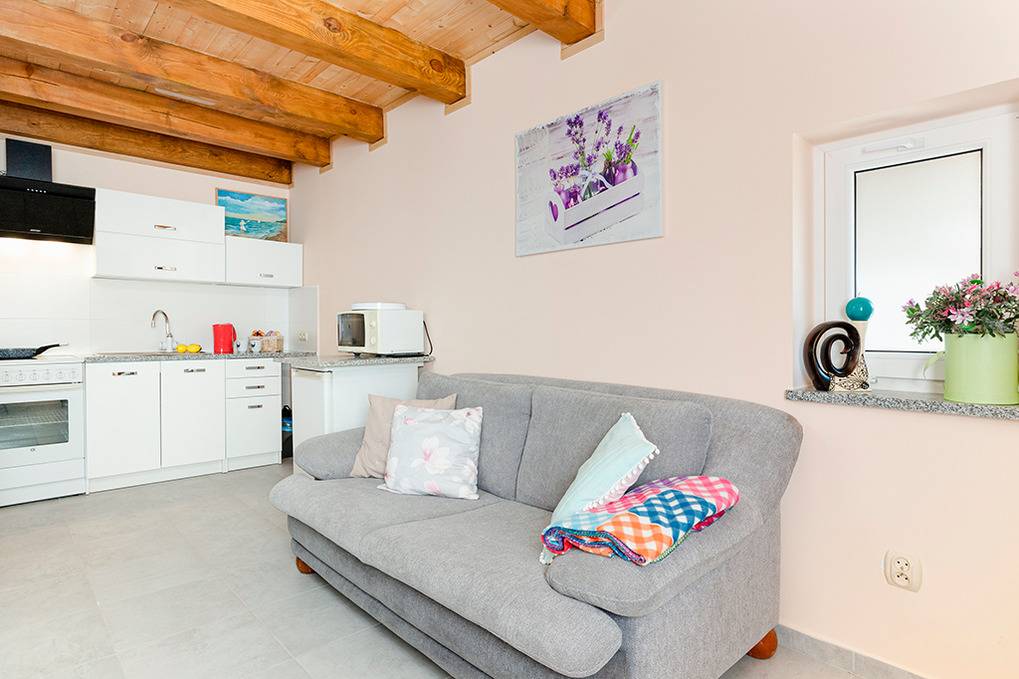 PL 31.12 Ferienhaus 2-4 Pers.: Neue 3-Zimmer-Haushälfte mit ca. 43 qm Wohnfläche über 2 Etagen. Heller, freundlicher Wohn-/Essraum mit rustikaler Holzbalkendecke, Sofa, Sat-TV (deutsche Programme), Esstisch, gut ausgestatteter Küchenzeile (Ceranfeld 4 Platten, Abzugshaube, Backofen, Mikrowelle). Bad: Du, Wb, WC. Treppe in die 1. Etage (Dachgeschoss): Doppelzimmer mit kleinem Balkon. 2-Bettzimmer.