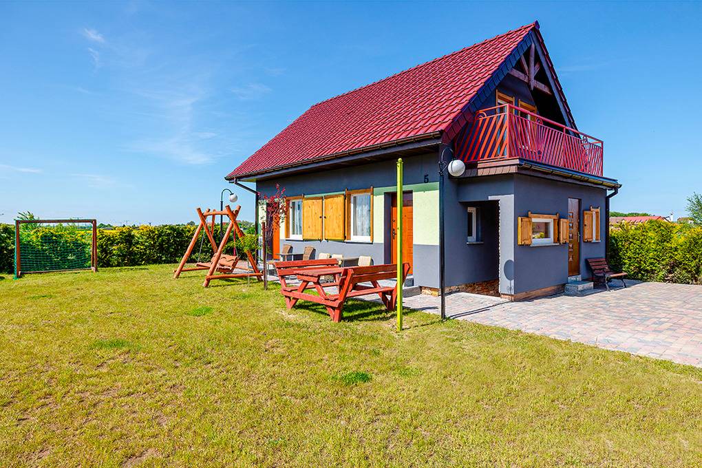 Haus: Kleine Ferienhausanlage mit insgesamt 6 Ferienhäusern, 2021 neu gebaut, auf einem großen, umzäunten Rasengrundstück (2.000 qm). Kleiner Spielplatz mit Trampolin, Klettergerüst.