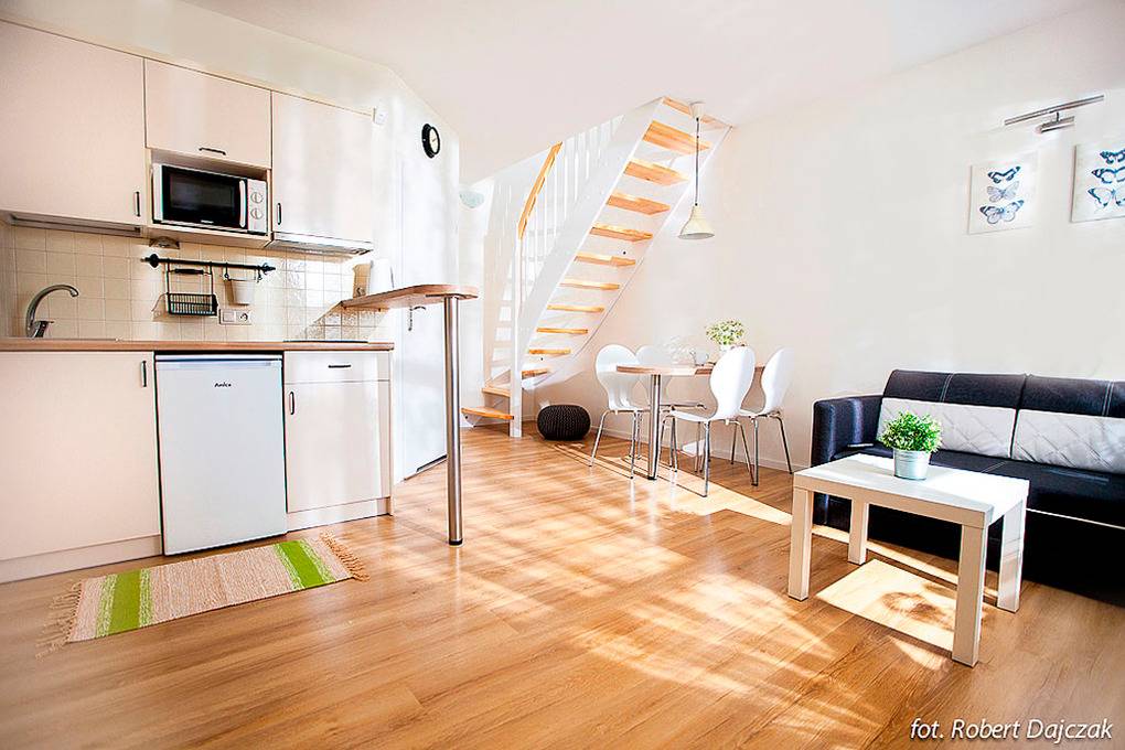 PL 31.14 Ferienhaus 2-5 Pers.: Komfortables 3-Zimmer-Reihenhaus mit ca. 55 qm Wohnfläche über 2 Etagen. Parterre: Wohn-/Essraum mit modernem Sofa (Schlafcouch 1 Pers.), Flachbild Sat-TV mit deutschen Programmen, Esstisch, Küchenzeile (2 E-Platten, Mikrowelle, Abzugshaube). Bad/WC. 1. Etage: Doppelzimmer. 2-Bettzimmer.