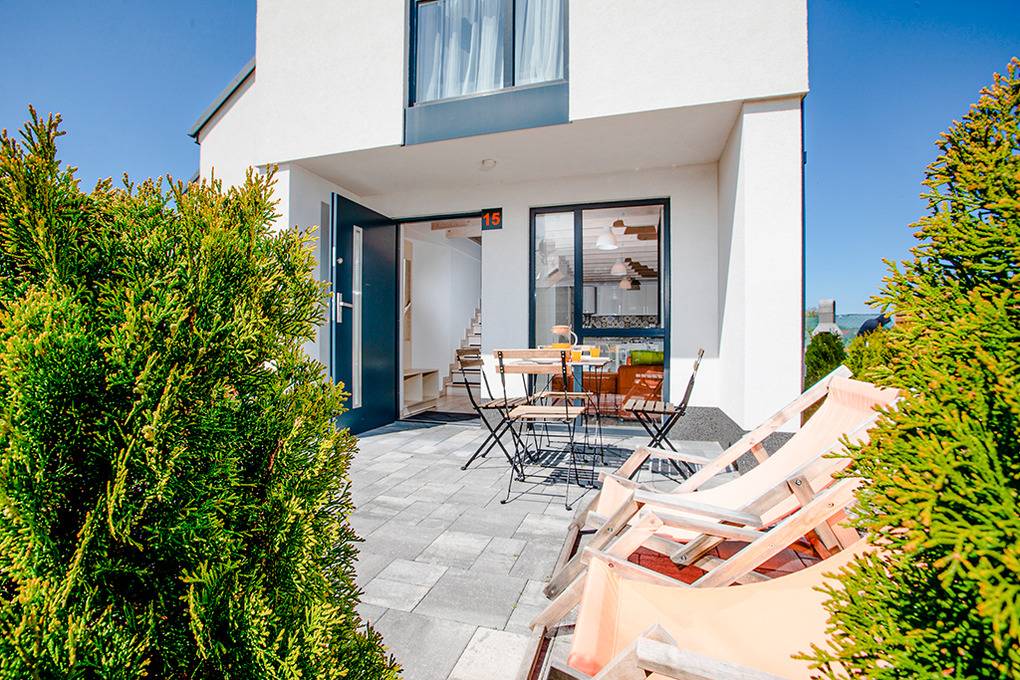 Haus: Gepflegte Ferienhaus-Anlage. Schöne, moderne Reihenhäuser mit wohnlicher Einrichtung. Kostenloses Internet (WiFi). E-Heizung, Warmwasser über E-Boiler (80 l). Terrasse mit Sitzmöbeln, Grill. In der Anlage Rezeption. Waschmaschine. Kinderspielplatz mit Schaukeln, Klettergerüst, Wippen, Rutschen. Gemeinschaftlicher Grillplatz. 6 Fahrräder inclusiv, leihbar über Rezeption nach Verfügbarkeit. 2 Pkw-Stellplätze/Haus.