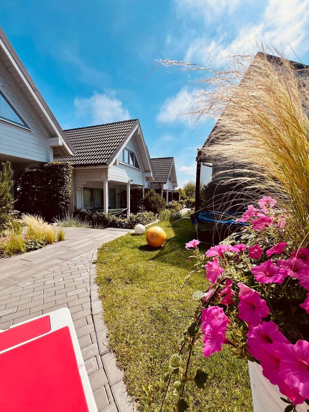 Haus: Schöne Ferienhausanlage, in 2024 neu gebaut. Großzügige, komfortable Chalets mit Whirlpool. Freundliche, gemütliche Einrichtung. Alle Häuser mit Klimaanlage (Kühl- und Heizfunktion). Kostenloses Internet über Wi-Fi. Terrasse mit Sitzmöbeln. Im Mietpreis inclusive: schöner Whirlpool (zur Verfügung von Anfang Mai bis Mitte September), kleiner Spielplatz (Schaukel, Rutsche, Sandkasten) zur gemeinschaftlichen Nutzung. Parkplatz auf dem umzäunten Gründstück nach Verfügbarkeit (Gebühr). Weitere Parkplätze auf dem öffentlichen Parkplatz neben der Anlage.