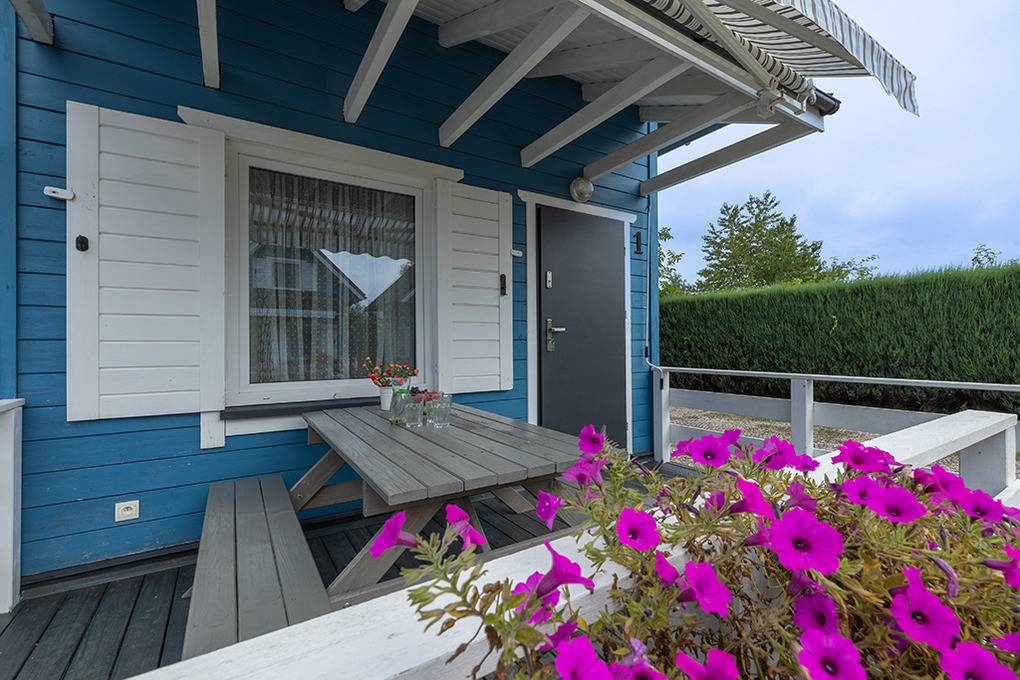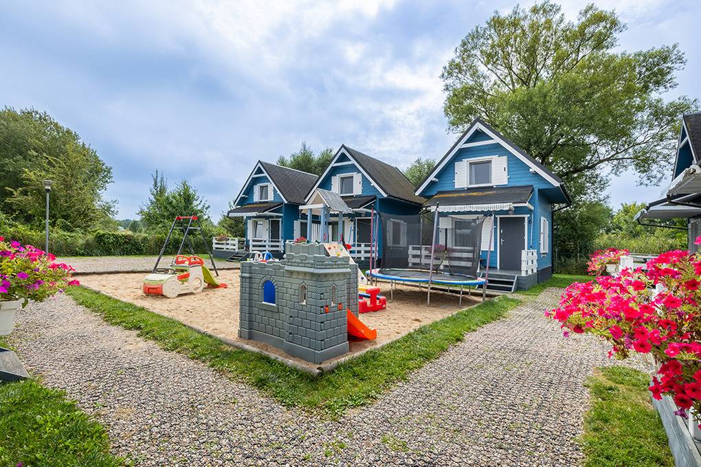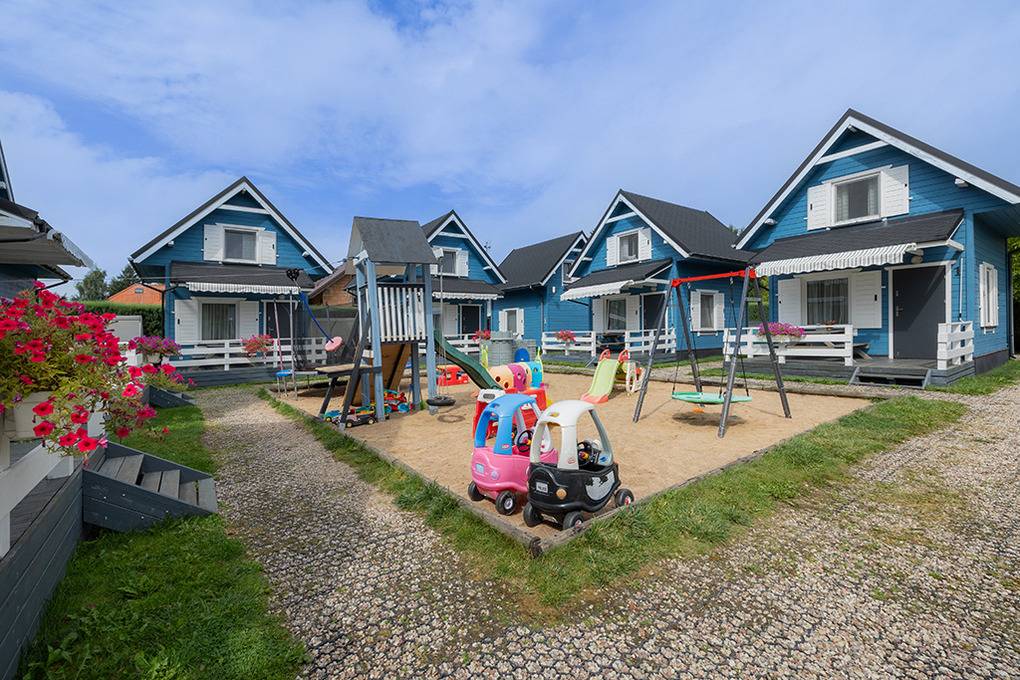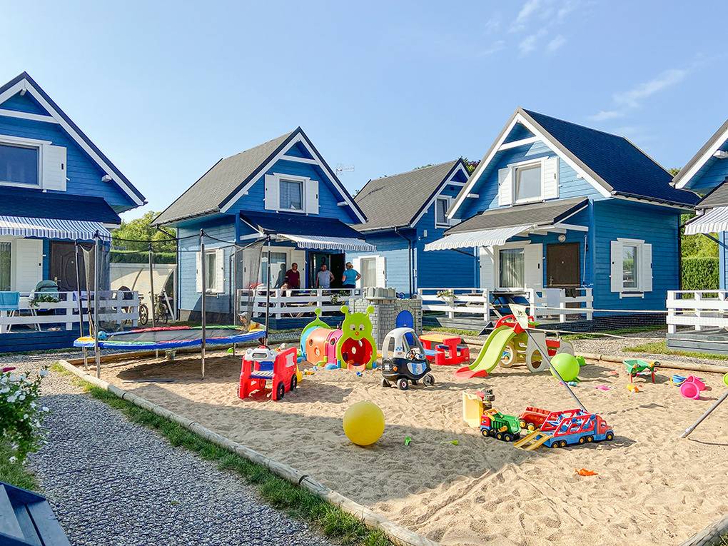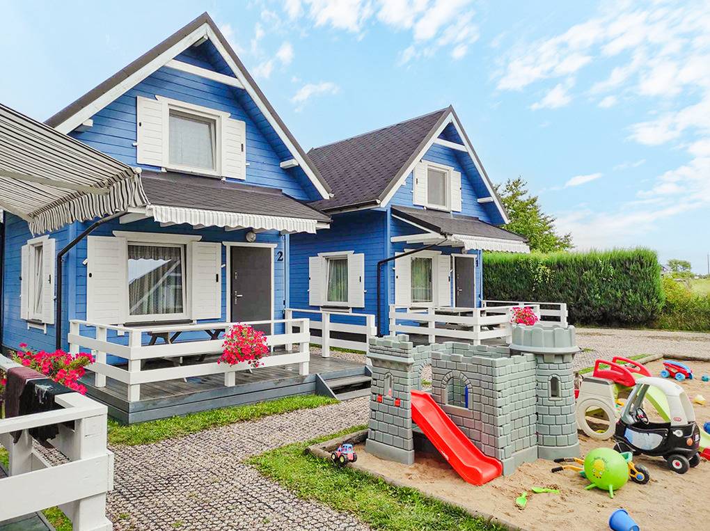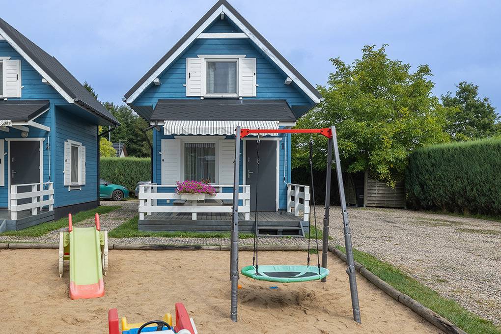 Haus: Schöne Ferienhausanlage mit 8 Holzblockhäusern. Freundliche Ferienhäuser mit funktionaler Einrichtung. Kostenloser Internetzugang (WiFi). Heizung mit E-Radiatoren, Warmwasser über E-Boiler (50 l). Terrasse mit Sitzmöbeln. In der Anlage: großer Kinderspielplatz. 1 Pkw-Stellplatz/Ferienhaus auf umzäuntem Grundstück.