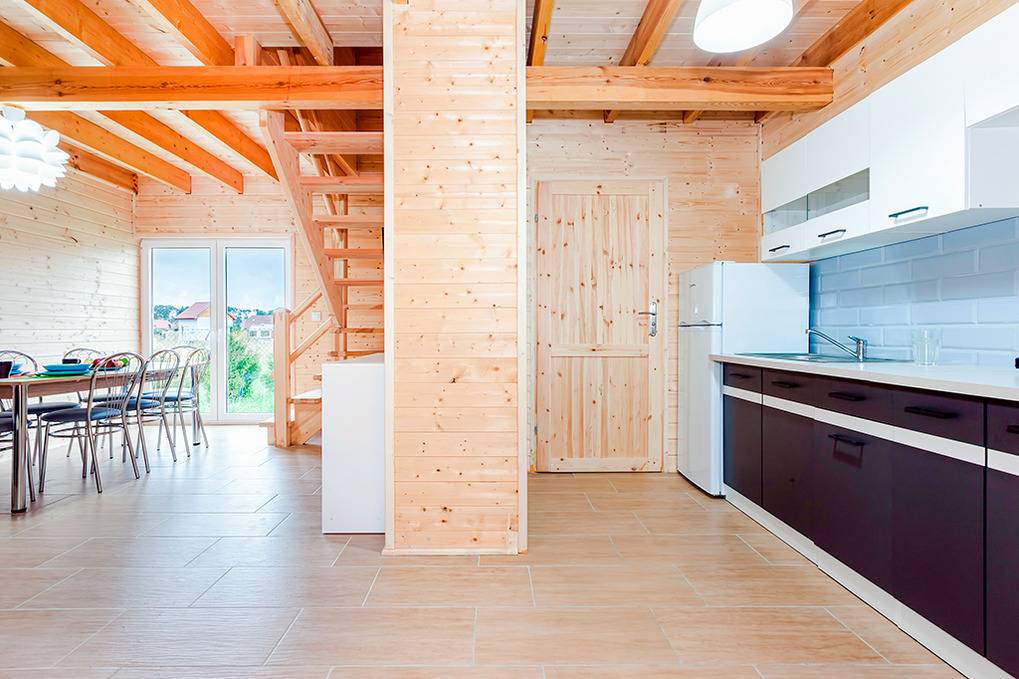 PL 31.10 Ferienhaus 2-8 Pers.: Gemütliches 3-Zimmer-Reihenhaus mit ca. 50 qm Wohnfläche über 2 Etagen. Wohn-/Essraum mit Sofa (Ausziehcouch 2 Pers.), Sat-TV (deutsche Programme), Esstisch, Küchenzeile (2 E-Platten). Bad: Du, Wb, WC. Vom Wohnraum Holztreppe ins Dachgeschoss: Zwei 4-Bettzimmer mit jeweils 2 Doppelbetten. Ein großer Balkon.