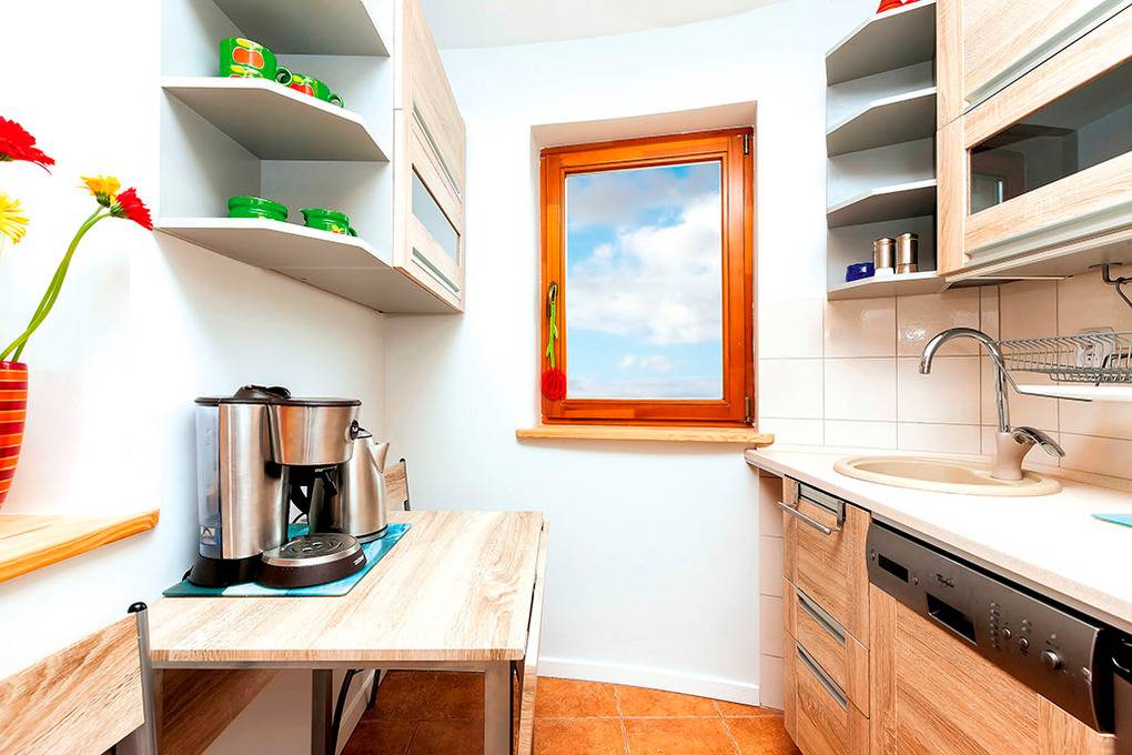 PL 31.4 Ferienhaus 2-5 Pers.: Gemütliches 3-Zimmerhaus mit 60 qm Wohnfläche über 2 Etagen. Heller, freundlicher Wohn-/Essraum mit rustikaler Holzbalkendecke, Kamin, Sitzgarnitur (Ausziehcouch für 1 Pers., Breite 120 x 200 cm), Sat-TV (deutsche Programme), Esstisch, kleine Küchenzeile (2 Induktionsplatten, Spülmaschine). Bad: Du, Wb, WC, Waschmaschine.1. Etage (Dachgeschoss): zur Treppe hin offenes 2-Bettzimmer, ausgebaut bis in den rustikalen Dachgiebel, mit Etagenbett, Balkon. Dahinter Doppelzimmer.