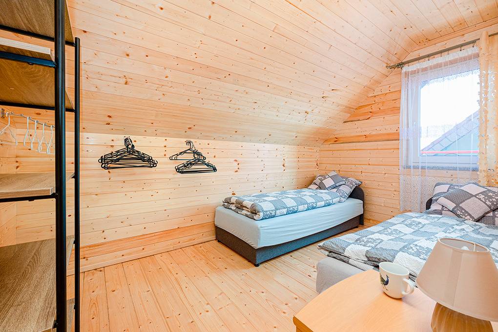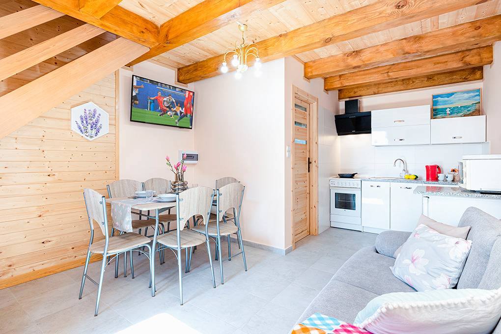 PL 31.12 Ferienhaus 2-4 Pers.: Neue 3-Zimmer-Haushälfte mit ca. 43 qm Wohnfläche über 2 Etagen. Heller, freundlicher Wohn-/Essraum mit rustikaler Holzbalkendecke, Sofa, Sat-TV (deutsche Programme), Esstisch, gut ausgestatteter Küchenzeile (Ceranfeld 4 Platten, Abzugshaube, Backofen, Mikrowelle). Bad: Du, Wb, WC. Treppe in die 1. Etage (Dachgeschoss): Doppelzimmer mit kleinem Balkon. 2-Bettzimmer.