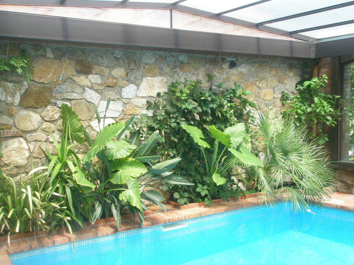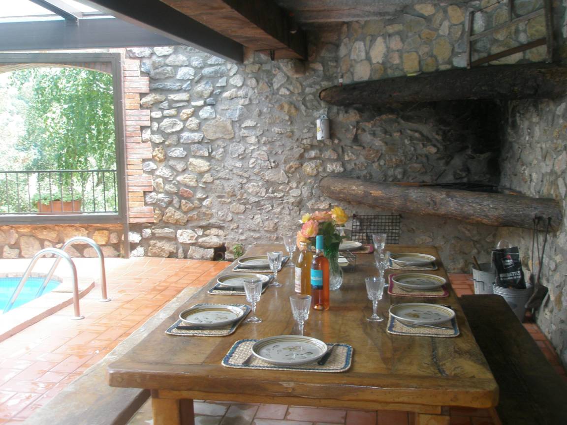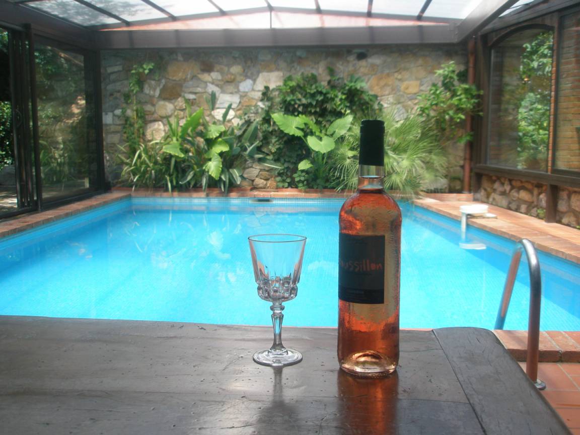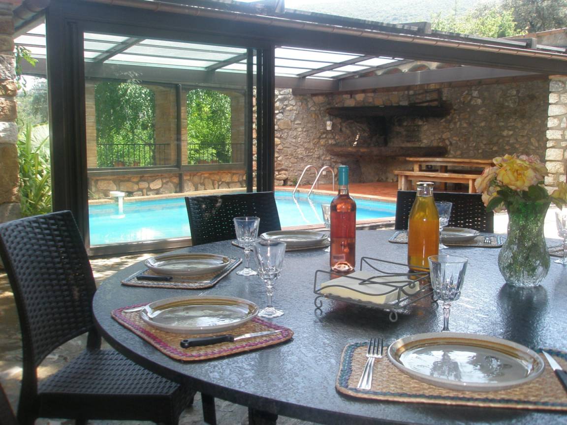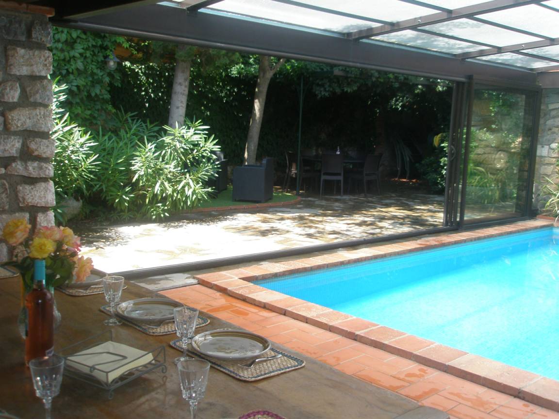 Privater 4 x 5 m großer Pool, gesichert durch eine Alarmanlage und geschützt durch eine Veranda, der auch in der Nebensaison zum Schwimmen einlädt. Eine überdachte Terrasse mit Grill und Grillplatte führt zu einer zweiten Sonnenterrasse mit Dusche und WC.