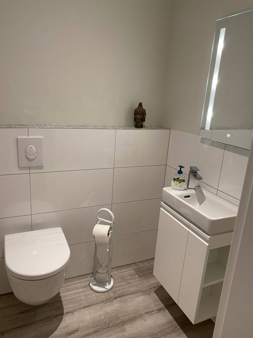 Komfortaustattung, Wohn-Essraum, Küche mit hochwertiger - komplett eingerichteter Einbauküche, Bistrotisch mit Hochstühlen, Gäste WC, Flur Garderobe im EG